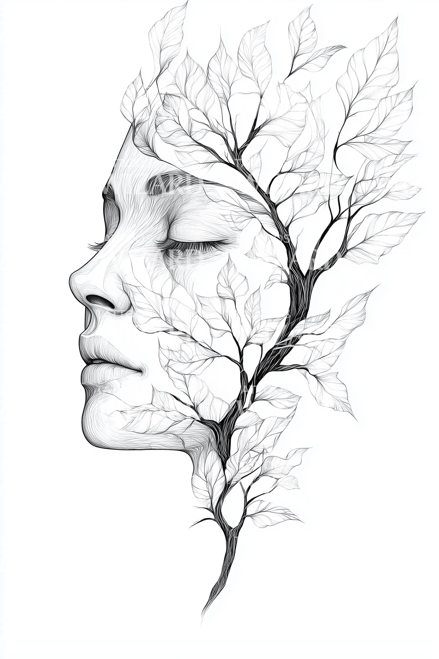 细线描绘的宁静面庞轮廓与纤细的树木、自然的叶子和根系融为一体。象征自我与自然的融合,在静谧中成长,智慧扎根。感觉如同平静的呼吸与扎实的清晰。非常适合前臂或小腿的垂直流线,肋骨处的亲密曲线,或上臂的平衡之选。