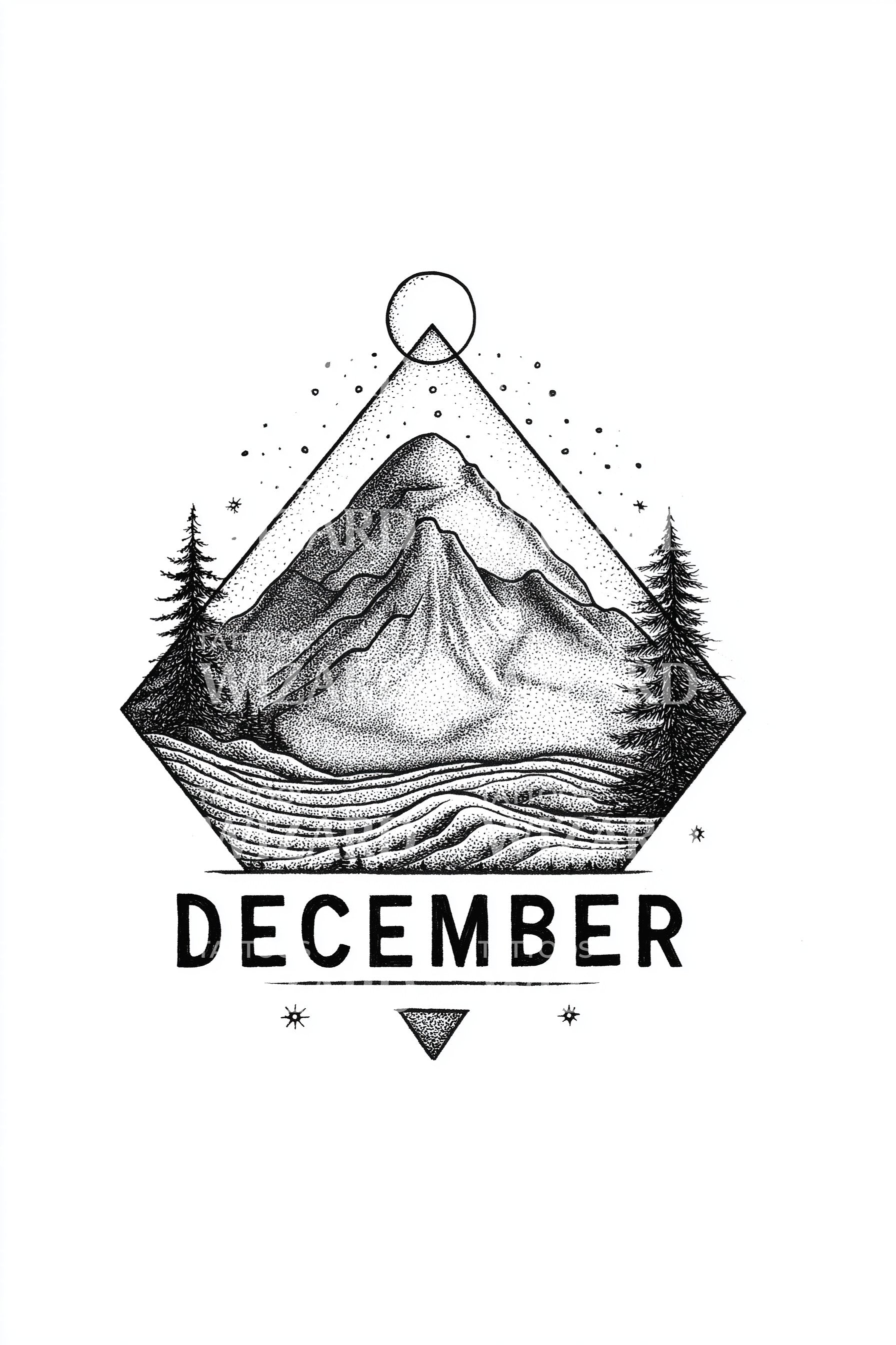 Geometric alpine badge in minimal dotwork, framing a towering peak inside a crisp triangle, dotted sky and solstice sun crowning the summit, pines anchoring the edges, DECEMBER grounded below. Symbol of winter clarity, resilience, and ascent. Worn on skin, it feels like cold air, steady breath, purposeful stillness.