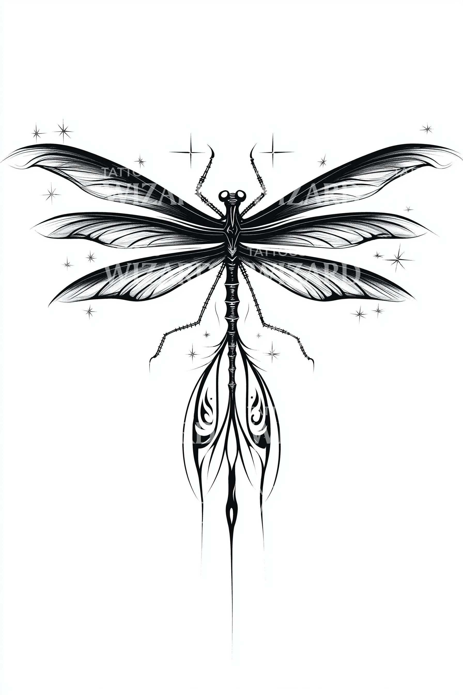 Dragonfly totem rises in black tribal filigree, four feathered wings shaded like smoke, a slender ornate tail tapering to a sacred point, surrounded by star-flecked air. Symbol of transformation and clear vision, it honors spirit and ancestry, gifting the wearer lightness, protection, and quietly radiant courage, every day.