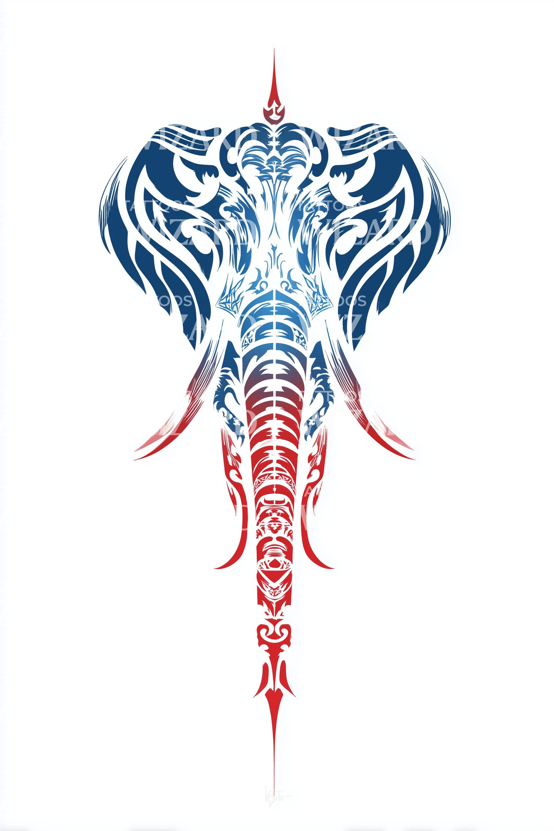 传承泰国文化遗产,这款部落风格的大象设计融合了大胆的几何图形与神圣的装饰线条。流畅的曲线勾勒出大象的力量与智慧,红色和蓝色的点缀增添了鲜明的对比。非常适合手臂、肩膀或背部,象征保护、忠诚与扎实的力量,兼具现代感与优雅。