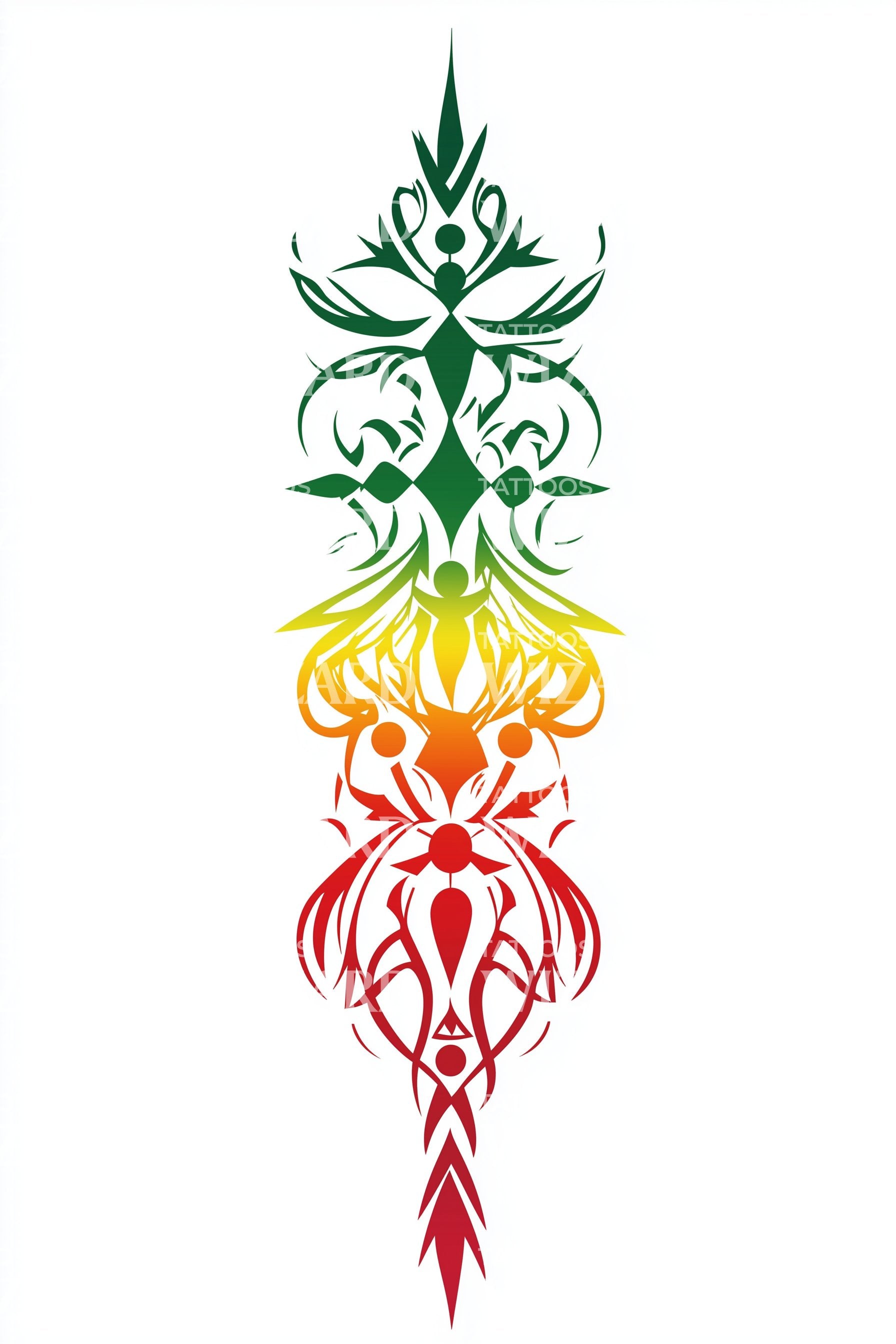 用这团部落火焰点燃你的灵魂,脉动着拉斯塔能量和非洲血脉。大胆而流畅的线条如烟雾般盘旋,象征着力量、韧性和前进的动力。非常适合手臂、胸膛或小腿,散发出温暖、节奏与身份的光辉——激情、根源与不可阻挡的流动的象征——力量、团结、自由。