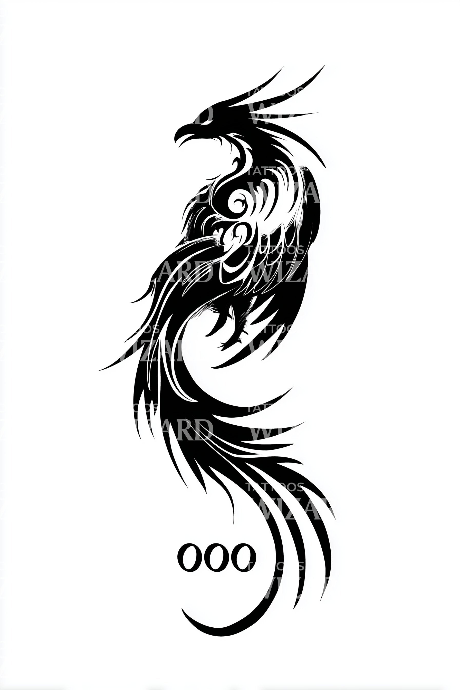 Rising from sleek black curves, this tribal phoenix flares with blade-like plumage and a long flame-tail, punctuated by three ember circles. An emblem of rebirth, it embodies fire and unbreakable spirit, shedding the past for luminous beginnings. On skin, the design feels fierce, protective, and defiantly alive.