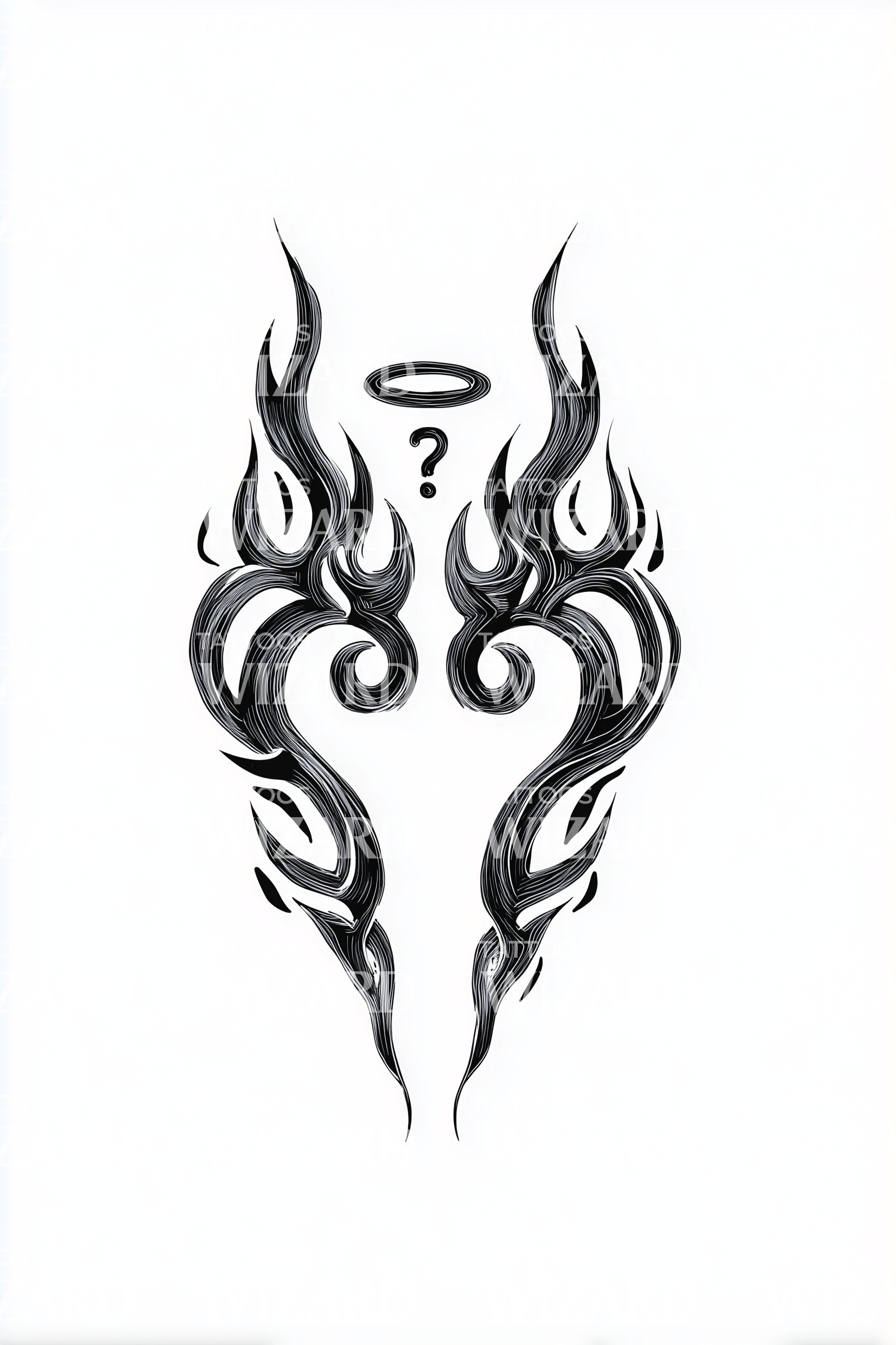 Twin, flowing tribal horns rise like a totem, their inked strands curling into guarded fire. Above, a simple halo hovers, while a small question mark invites wonder. Symbol of the vigilant guardian within, this design channels courage and balance, gifting the wearer grounded strength and luminous, everlasting mystery.