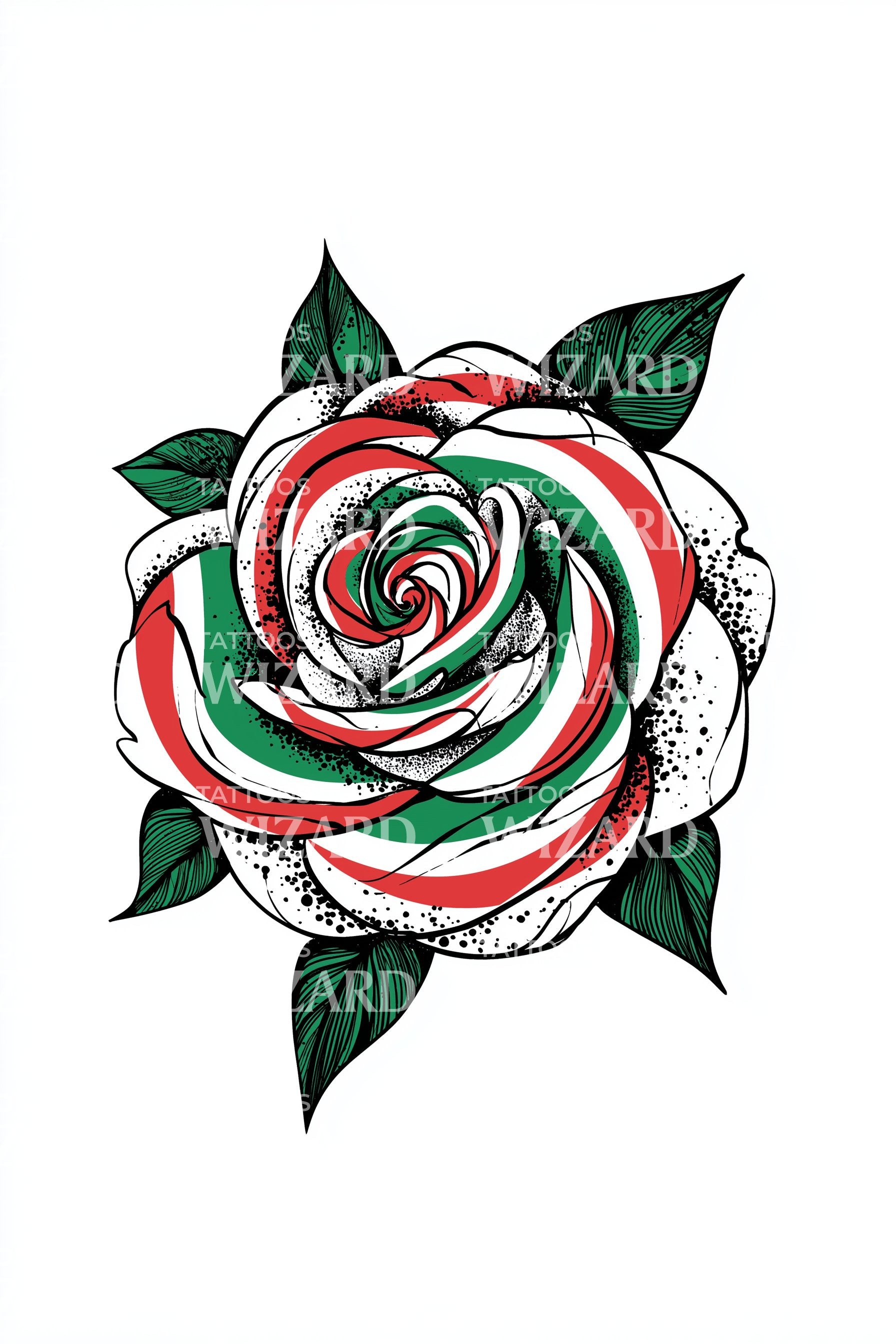 拥抱你内心的意大利精神,选择我们的新传统纹身设计。这件精美作品巧妙融合了意大利标志性的绿色、红色和白色调,编织成一朵惊艳的玫瑰图案,象征着激情与魅力。用这款引人注目的意大利遗产象征,表达你独特的身份。