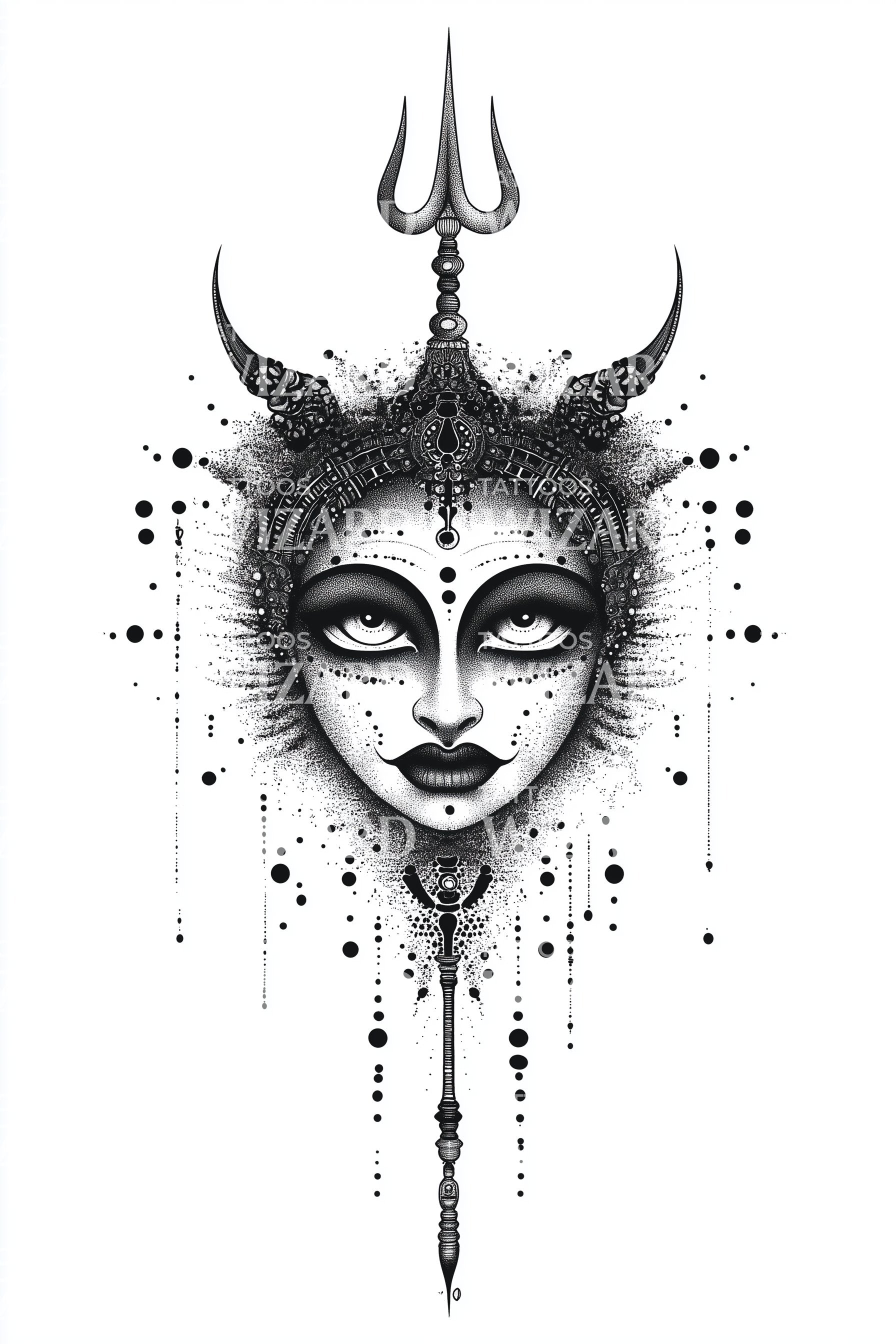 释放无尽无畏的能量,这款部落纹身设计展现了神秘的角饰女神,戴着面具,手持强大的三叉戟,是对女性力量的非凡致敬。以精致的点描风格精心手工制作,这一设计融合了神秘与力量的震撼魅力。