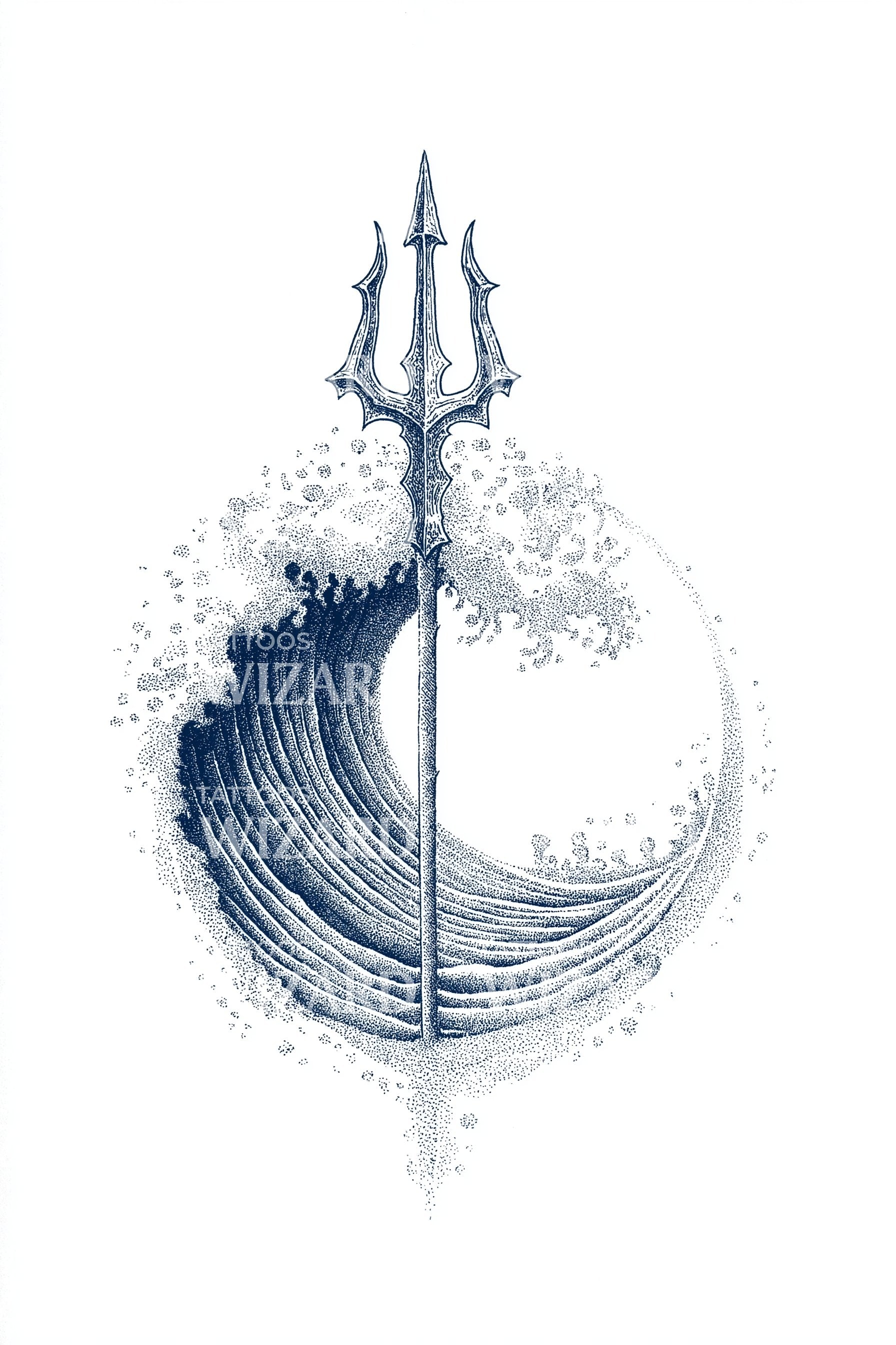 靛蓝水彩与点描细节形成一波翻涌的浪潮,环绕着一把矗立的三叉戟。作为波塞冬的象征,它唤起保护、水的掌控以及风暴中的宁静。宛如一首力量的赞歌。非常适合纹在前臂以展现流动感,小腿以呈现曲线,肋骨处以表达呼吸,肩胛骨上以体现运动感。