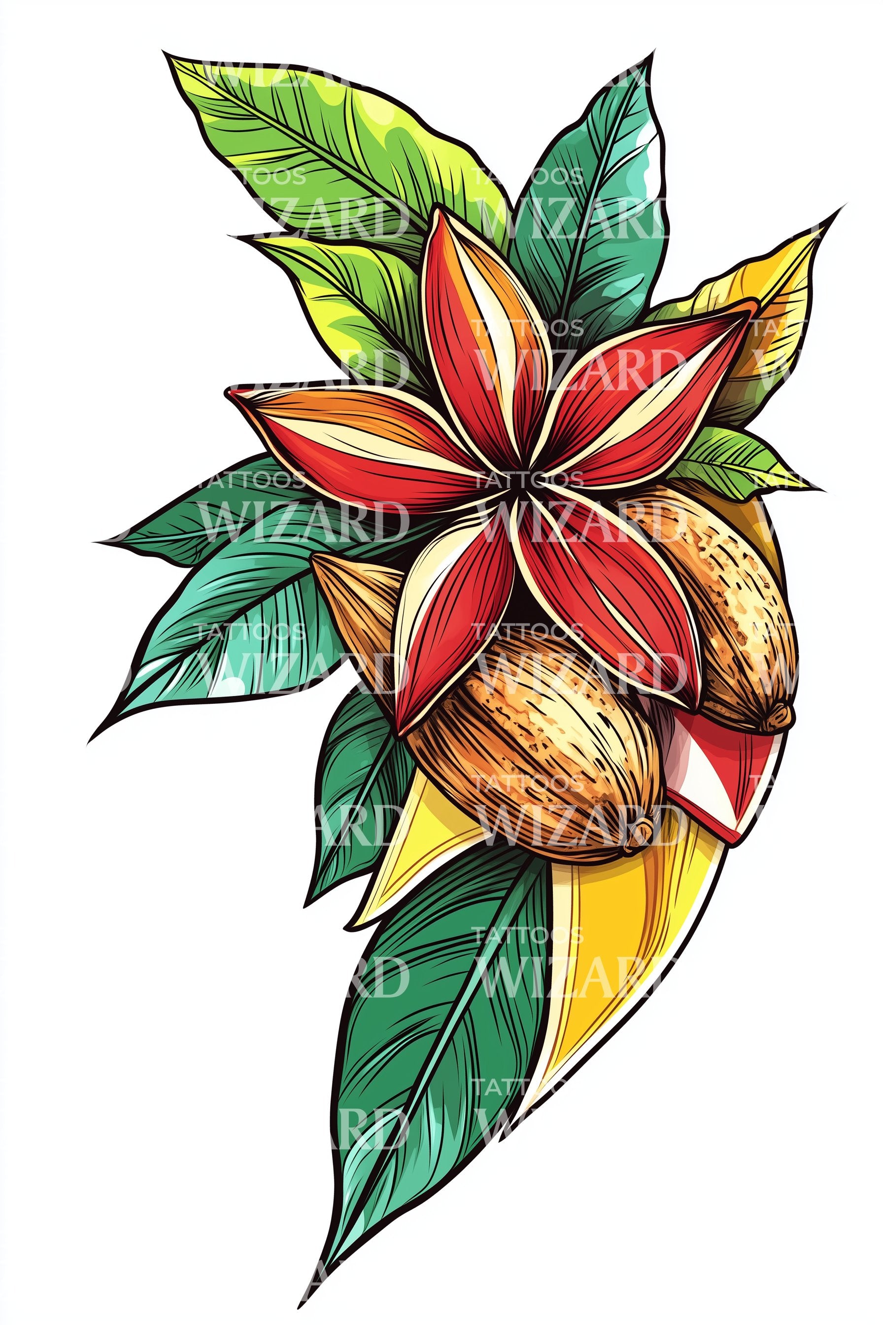 对特立尼达和多巴哥的郁郁葱葱的植物致敬:可可花和果荚与热带叶片交织,流畅的线条优雅呈现。细腻的红、黑、白色点缀呼应国旗,庆祝传统与可可工艺。为热爱自然、怀抱岛屿灵魂和心怀远方的你,呈现一款精致的花卉宣言。