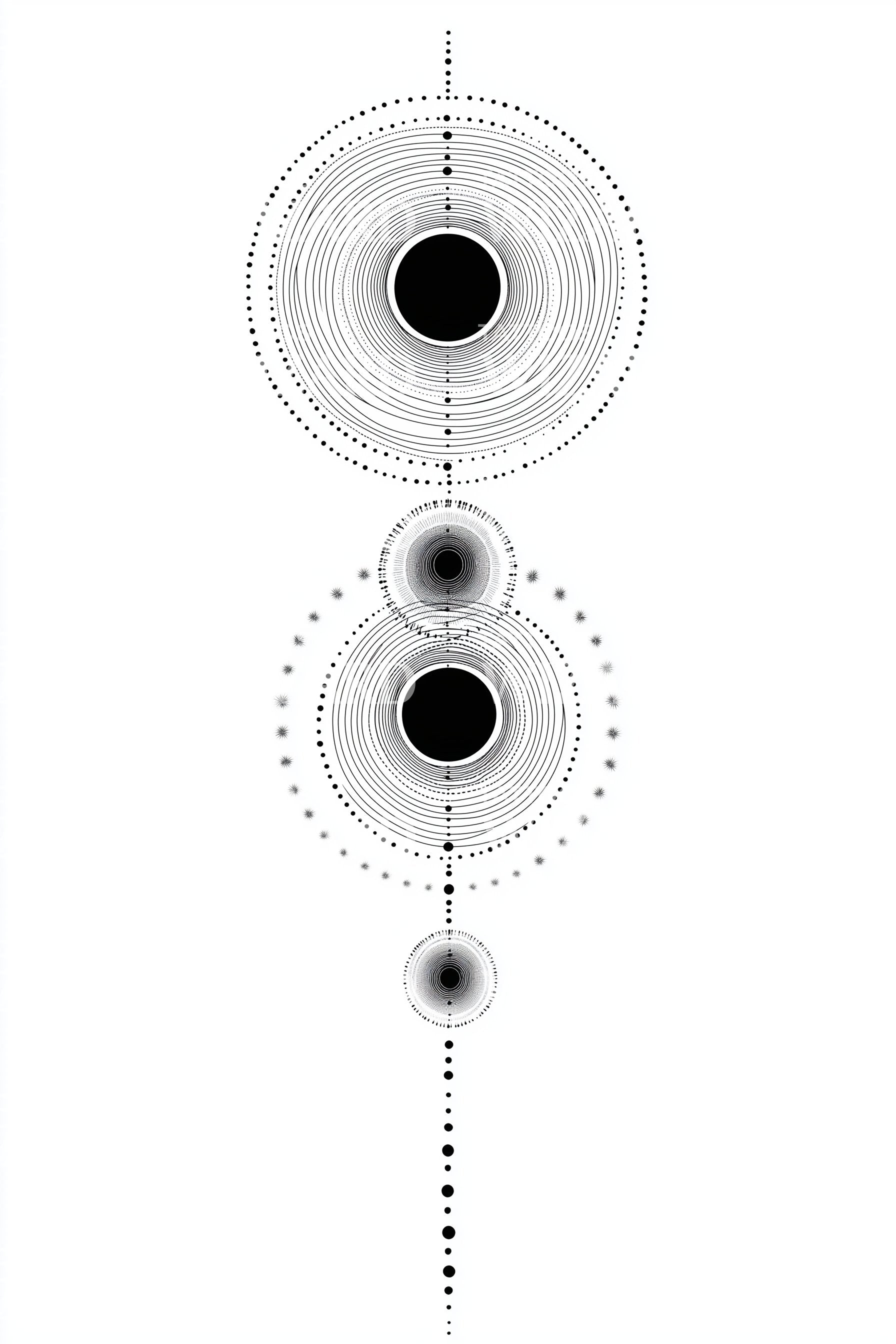 Stacked eclipses bloom in precise dotwork, concentric rings and orbiting specks forming a vertical cosmos. Each dark core symbolizes renewal, planets tracing cycles of growth and gravity of intention. Wearing it feels centered and celestial, a quiet alignment that steadies breath and keeps horizons opening toward endless orbits.