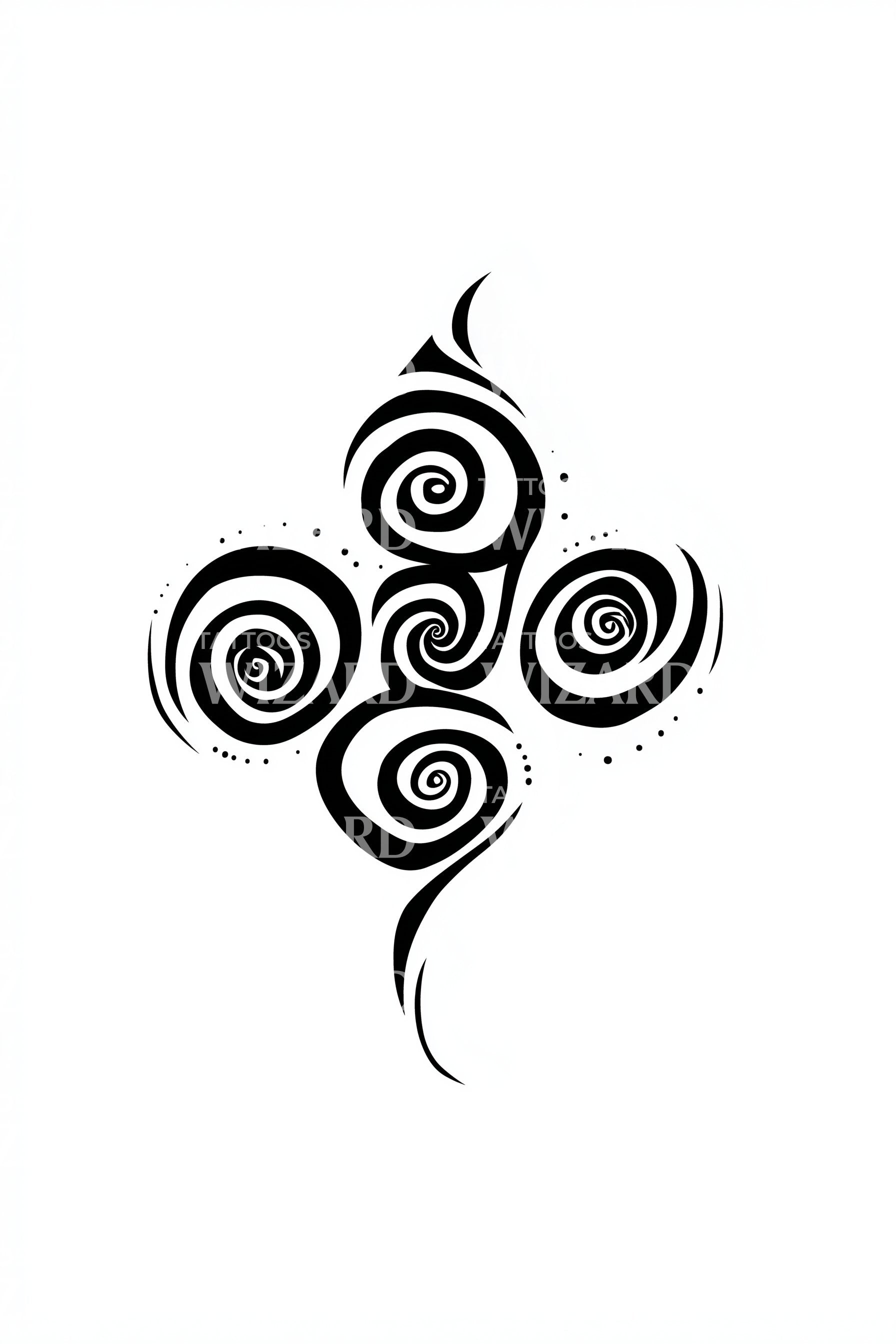 Bold black spirals interlace into a tribal triskelion, dotted accents orbiting like sparks. Celtic knot energy flows inward and outward, a symbol of motion, balance, and the cyclical braid of past, present, future. Worn on skin, it radiates grounded strength, restless creativity, and protective, enduring spirit.