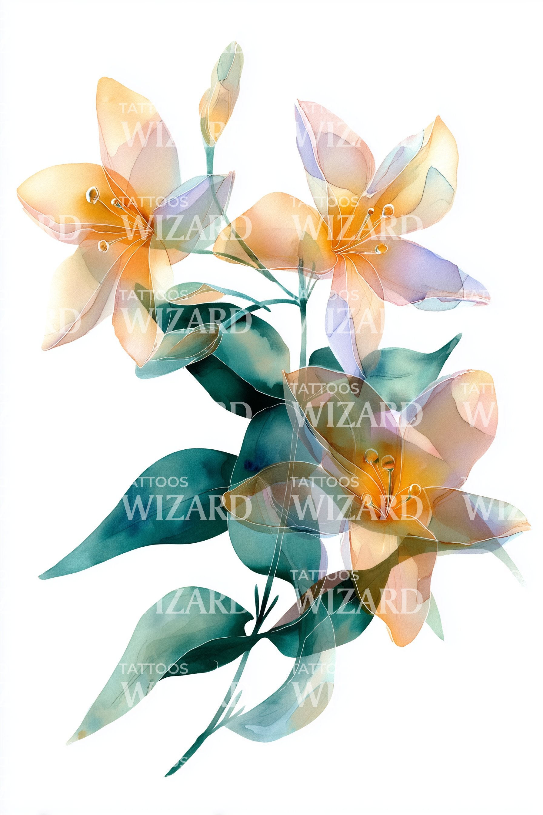 沉醉于大自然的美丽,这款热带花卉纹身设计以生动的水彩技法精心呈现,郁郁葱葱的绿色叶片与鲜艳的橙色花朵交织出一场色彩的交响乐。此纹身融合了艺术气息与热带优雅,是极致的身体装饰之选。