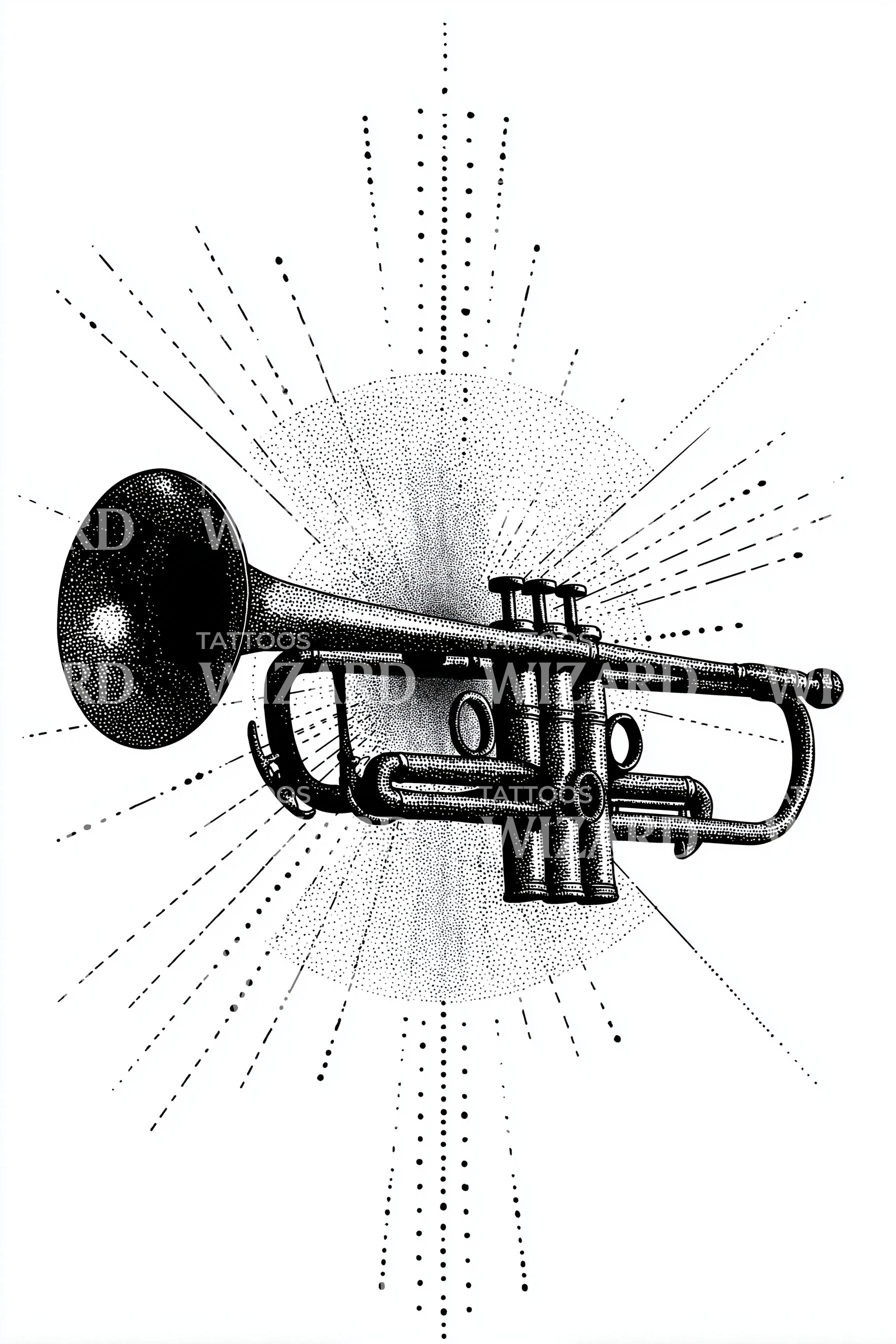 用这款富有表现力的插画风纹身设计点燃你对音乐的热情。设计中以引人入胜的小号为主题,迸发出声音与能量,象征着比言语更响亮的灵魂铜管旋律。这款纹身凝聚了无拘无束的音乐狂喜的节奏与活力。