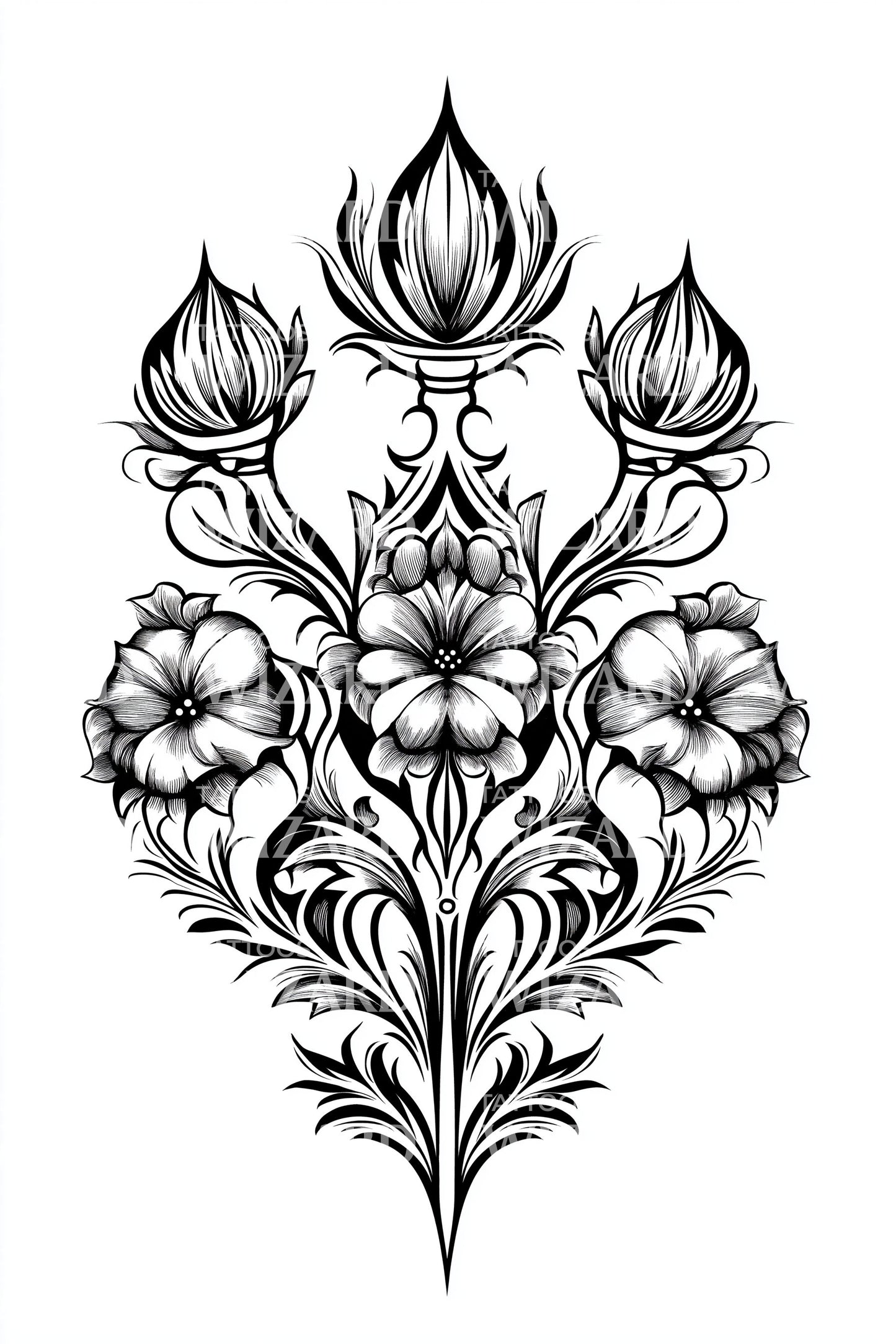 沉浸于巴洛克与花卉艺术的完美融合,这款装饰性纹身设计展现了精致的郁金香花束与复杂的卷轴花纹交织,带来优雅的皇家气息。这幅华丽的艺术作品完美捕捉了永恒花卉魅力的迷人风采。