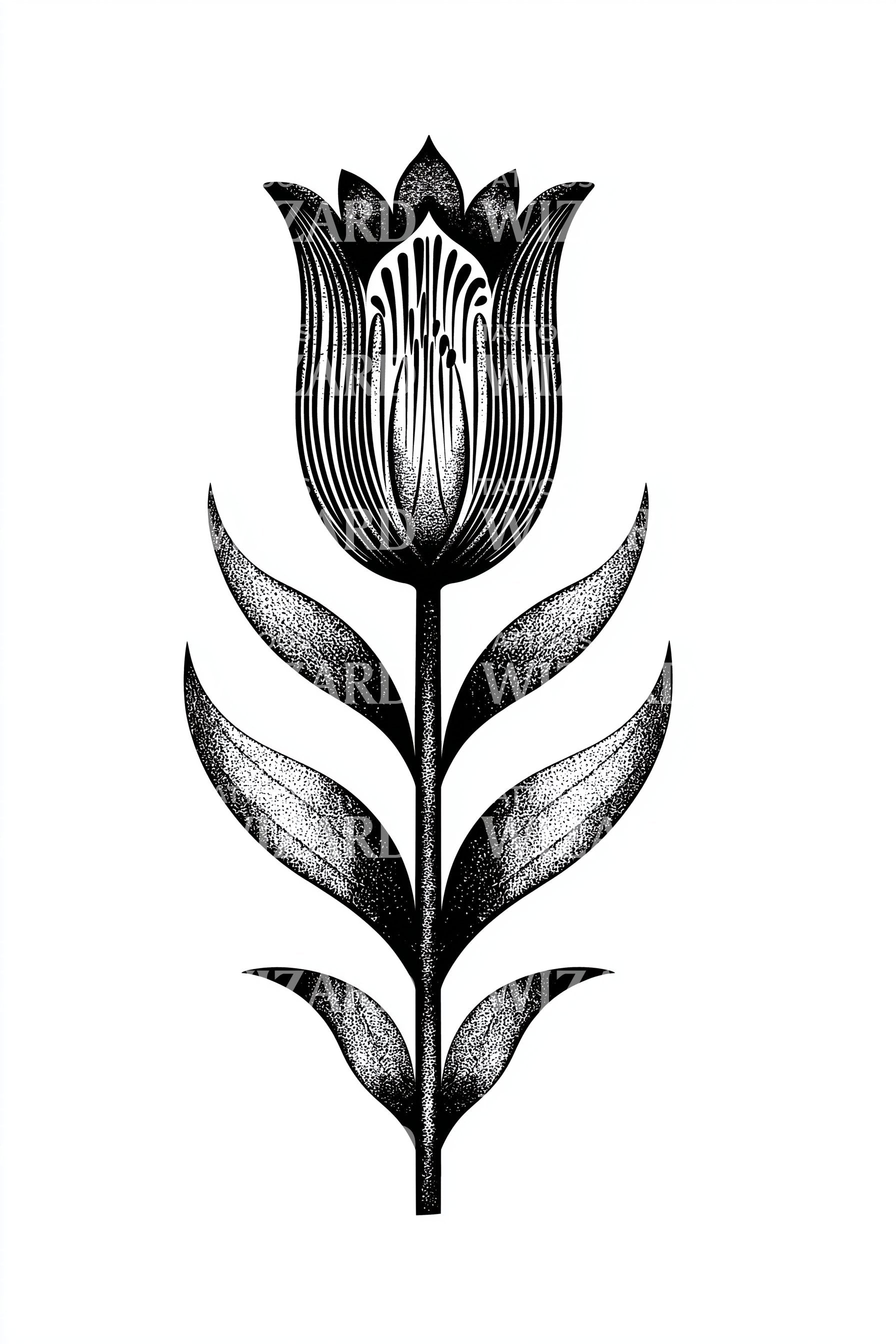 Refined tulip silhouette rises on a slender stem, fine lines and soft dotwork shading sculpting petal and leaf. A symbol of renewal, grace, and steadfast love, this botanical emblem honors quiet strength. Wearing it feels serene and poised, a minimal, elegant reminder to bloom with intention each day.