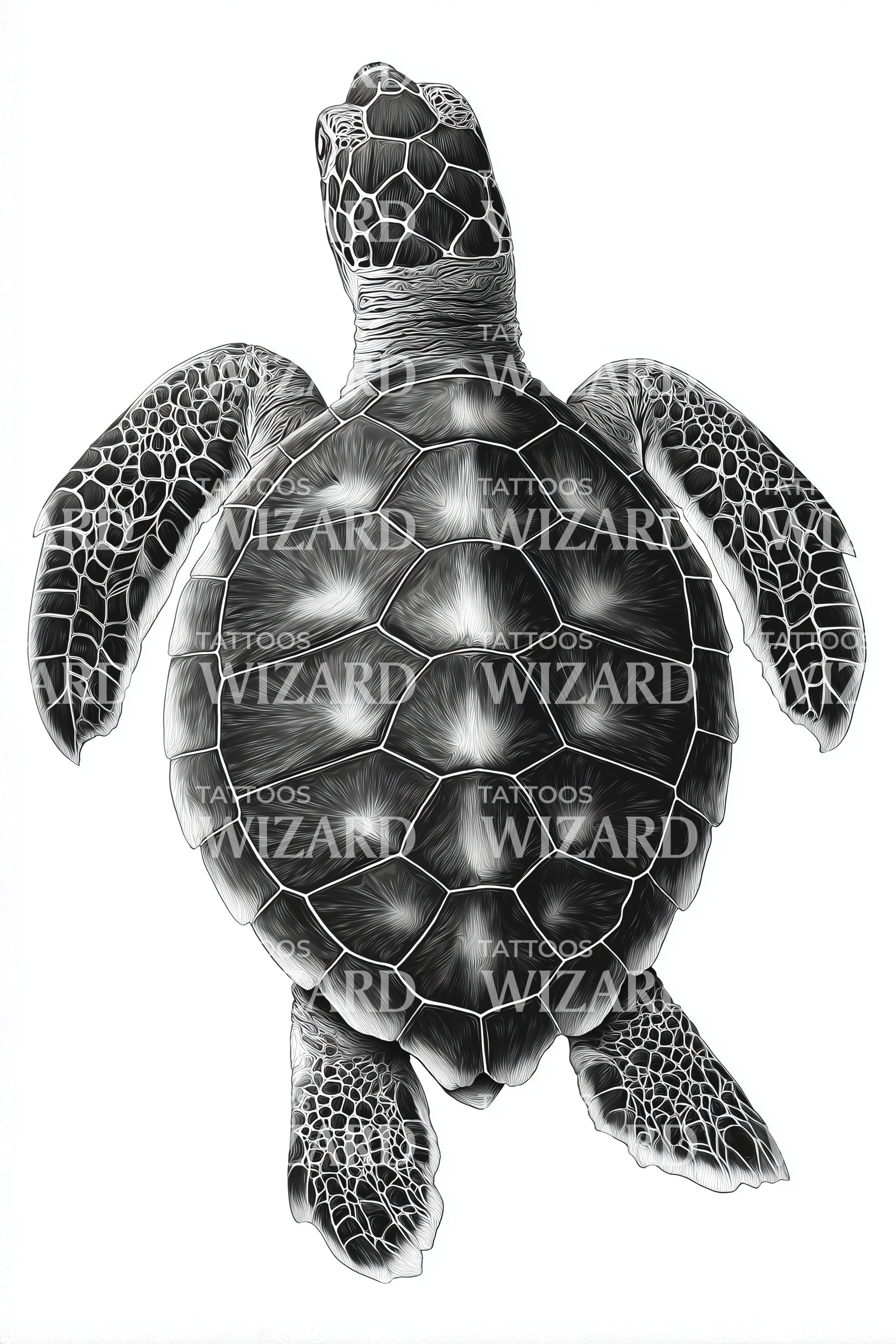 沉浸于海洋之美的深邃魅力,这款黑灰纹身设计展现了一只守护的海龟探索海洋深渊,其精细雕琢的龟壳象征着坚韧与优雅。作为对动物爱好者和海洋爱好者的致敬,这一设计将自然与艺术完美交织。