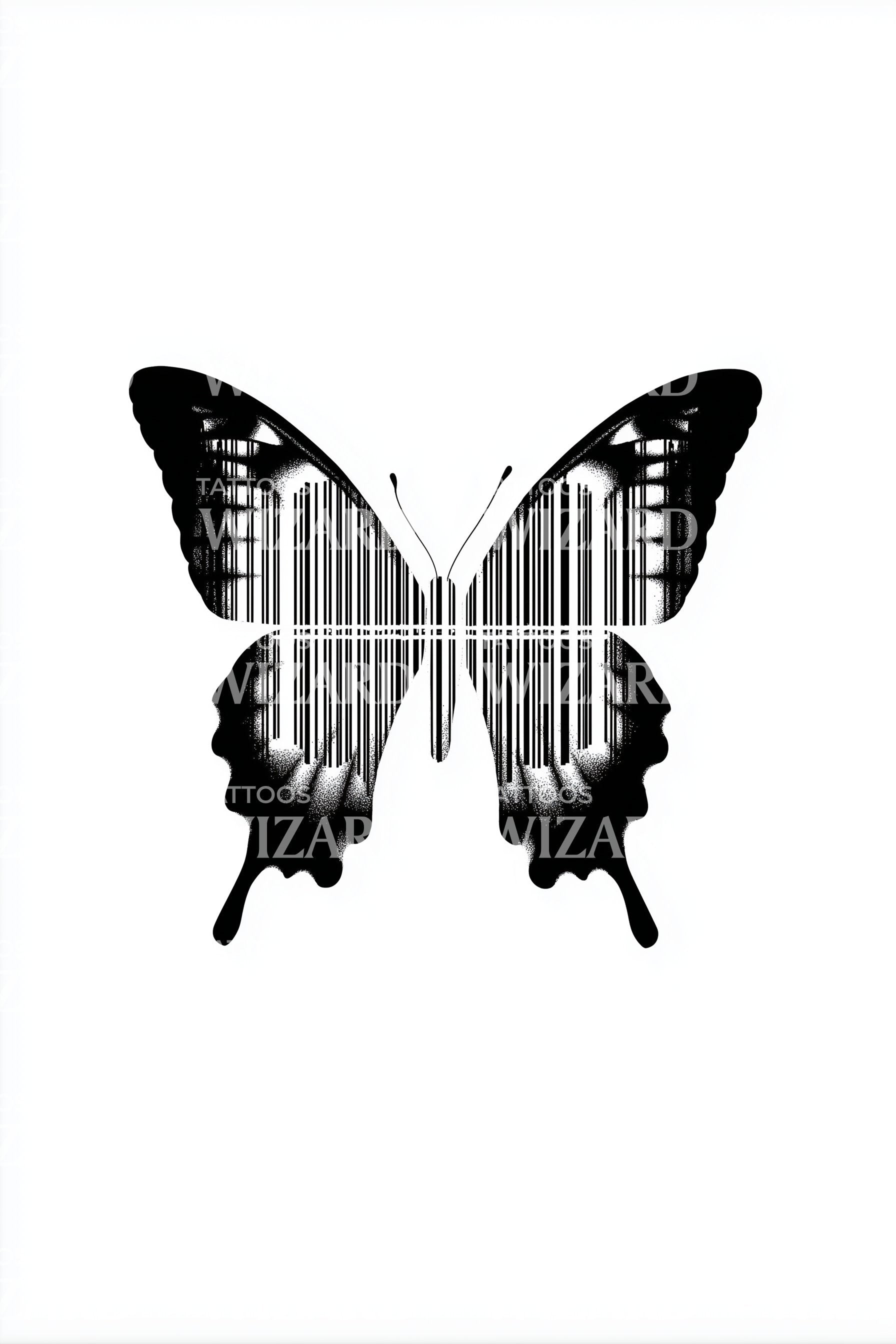 Blackwork symmetry frames a butterfly with barcode stripes crossing the wings, crisp lines fading into soft grain. Modern and abstract, it fuses nature and commerce. Symbolizes transformation beyond labels, freedom reclaimed from systems. Worn on skin, it feels poised, rebellious, and deeply personal, an unscannable identity in motion.
