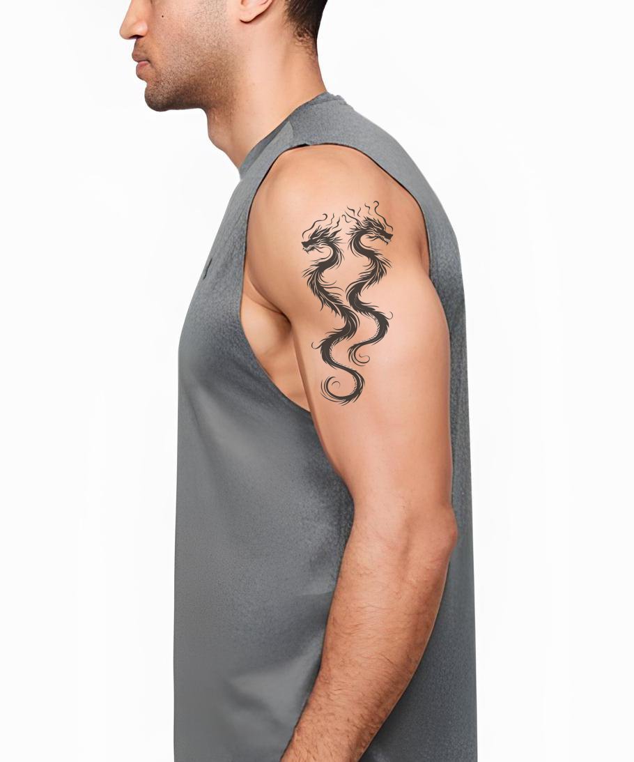 Twin blackwork dragons coil in mirrored grace, carved from bold ink and negative space, their serpentine manes flickering like smoke. Symbolizing twins, yin, and living flow, they weave protection and renewal. Worn, the design channels focused energy, fierce calm, and a loyal, ever-moving spirit through each steady breath.
