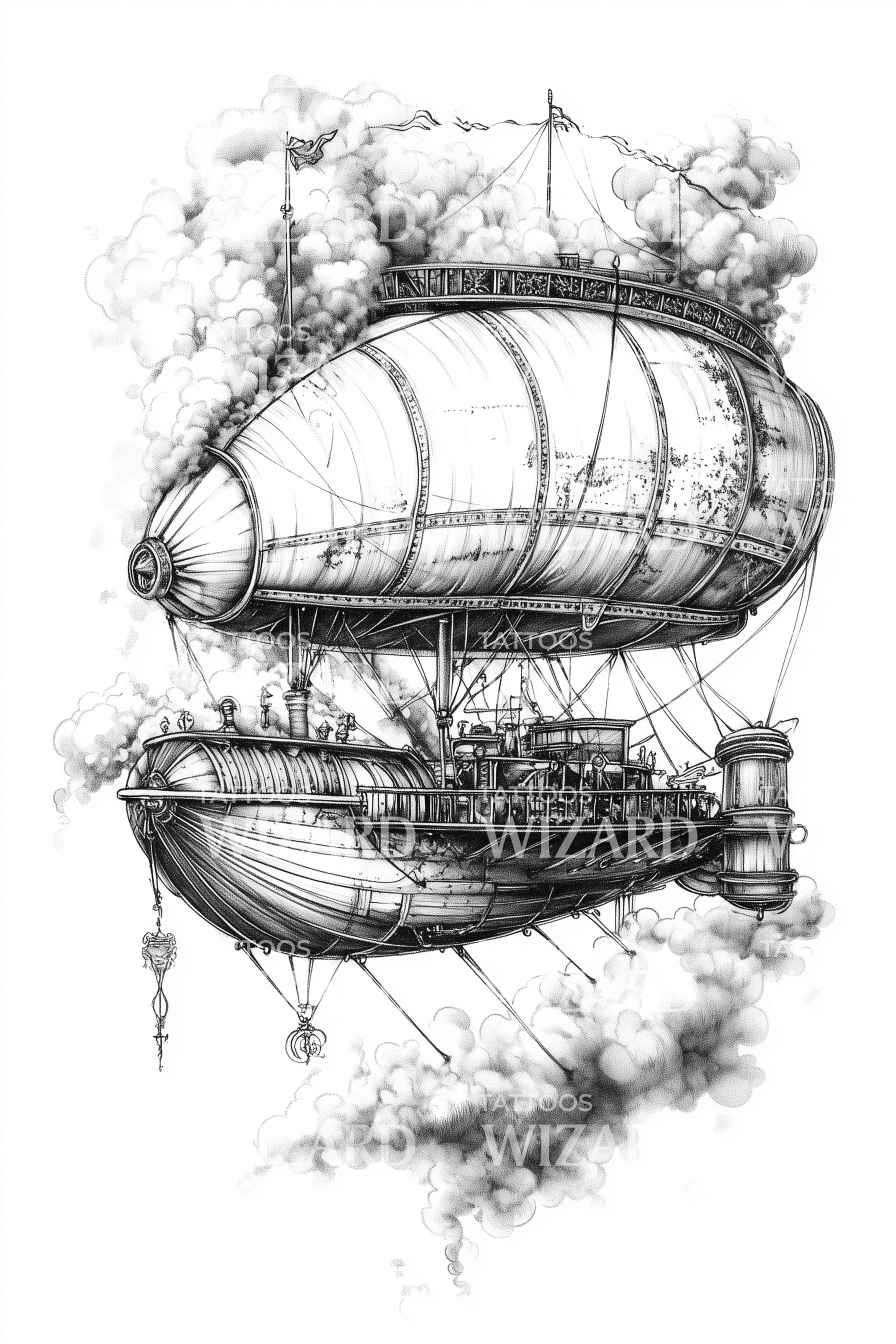 探索这款双飞艇纹身设计中蒸汽朋克美学与艺术素描的独特融合。它描绘了两只飞艇在云端航行,细节精美绝伦。对于蒸汽朋克文化和复古航空的爱好者来说,这是一个引人注目的完美选择。