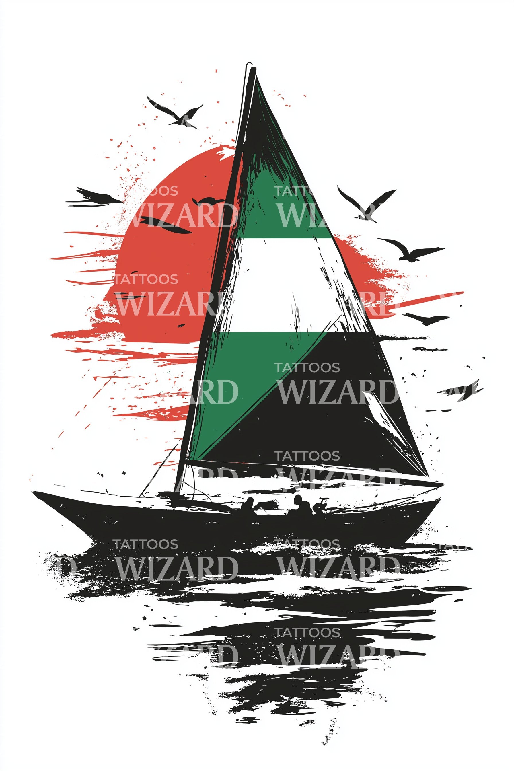 随着这款水彩纹身,漂入梦幻般的阿拉伯海湾夜晚:一艘精致的帆船滑过海面,鸟儿掠过泛着玫瑰金光辉的阿联酋落日。柔和的色彩交融天空与海水,唤起浪漫、旅行的渴望与宁静——完美适合热爱海岸宁静与永恒航海诗意的你,在每一次旅程中感受。