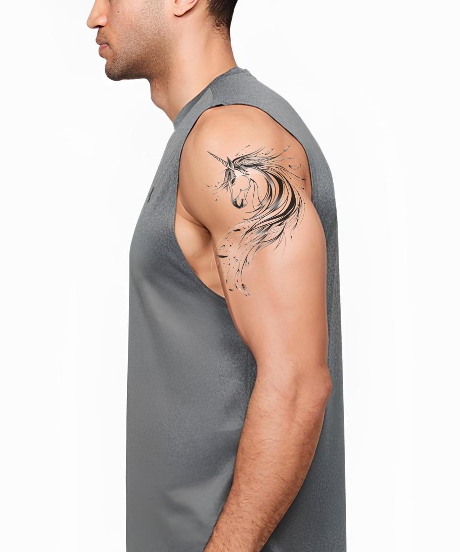 看,这是一幅美丽的威严与神话的融合,展现了这款素描纹身设计。这匹引人注目的马优雅地化身为神话中的独角兽,将自然动物之美与幻想相结合。其素描般的细节赋予了独特而原始的魅力,为你的肌肤故事注入了生命与魔力。
