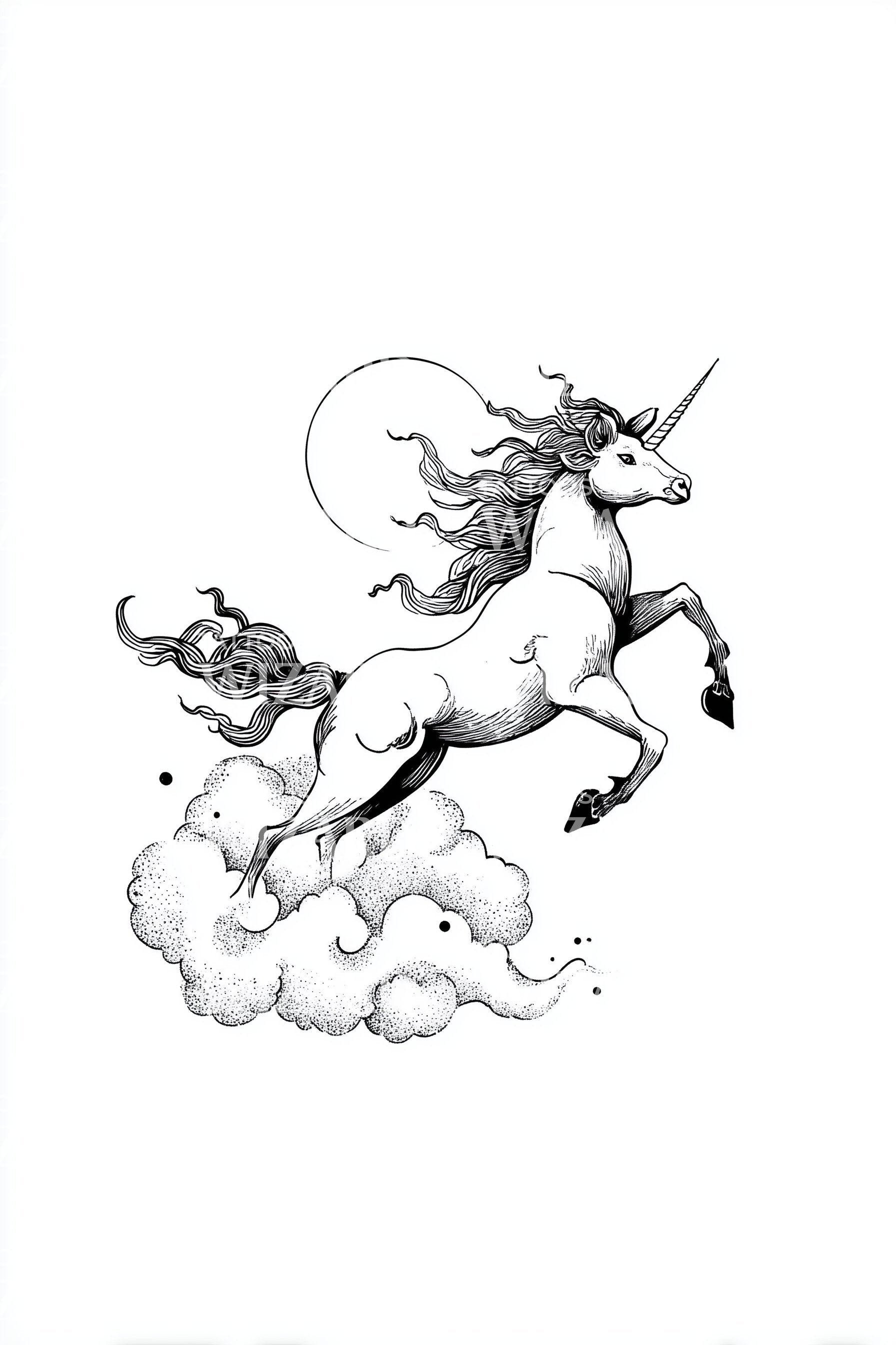 星光线条描绘出一匹扬蹄的独角兽,背景是柔和的月亮,鬃毛飞扬,蹄子掠过点缀的云朵。作为纯洁与无限可能的象征,它传递着天体魔法与梦幻般的勇气。仿佛静谧而生动的幻想。理想位置:前臂或小腿以展现流动感,肋骨或大腿以呈现纵向的宽广动势。