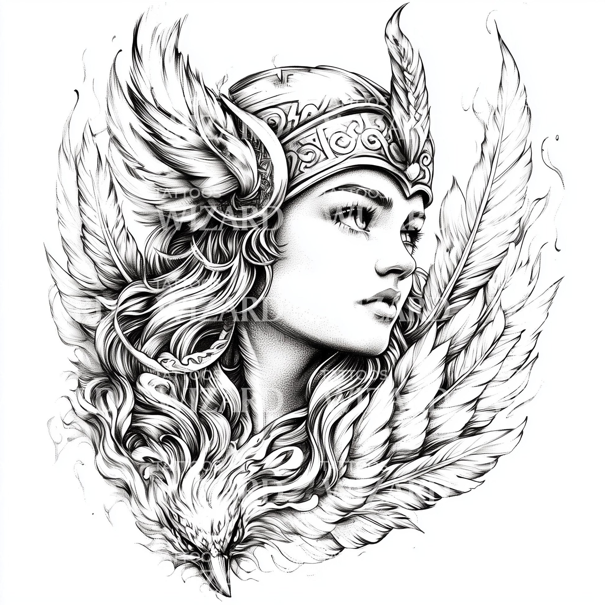 沉浸在神祇与战士的领域中,这款黑灰色的女武神纹身设计展现了一位强大的神话女性战士。配有翅膀、头盔和坚韧的精神,这件作品完美体现了北欧传说与女性力量。