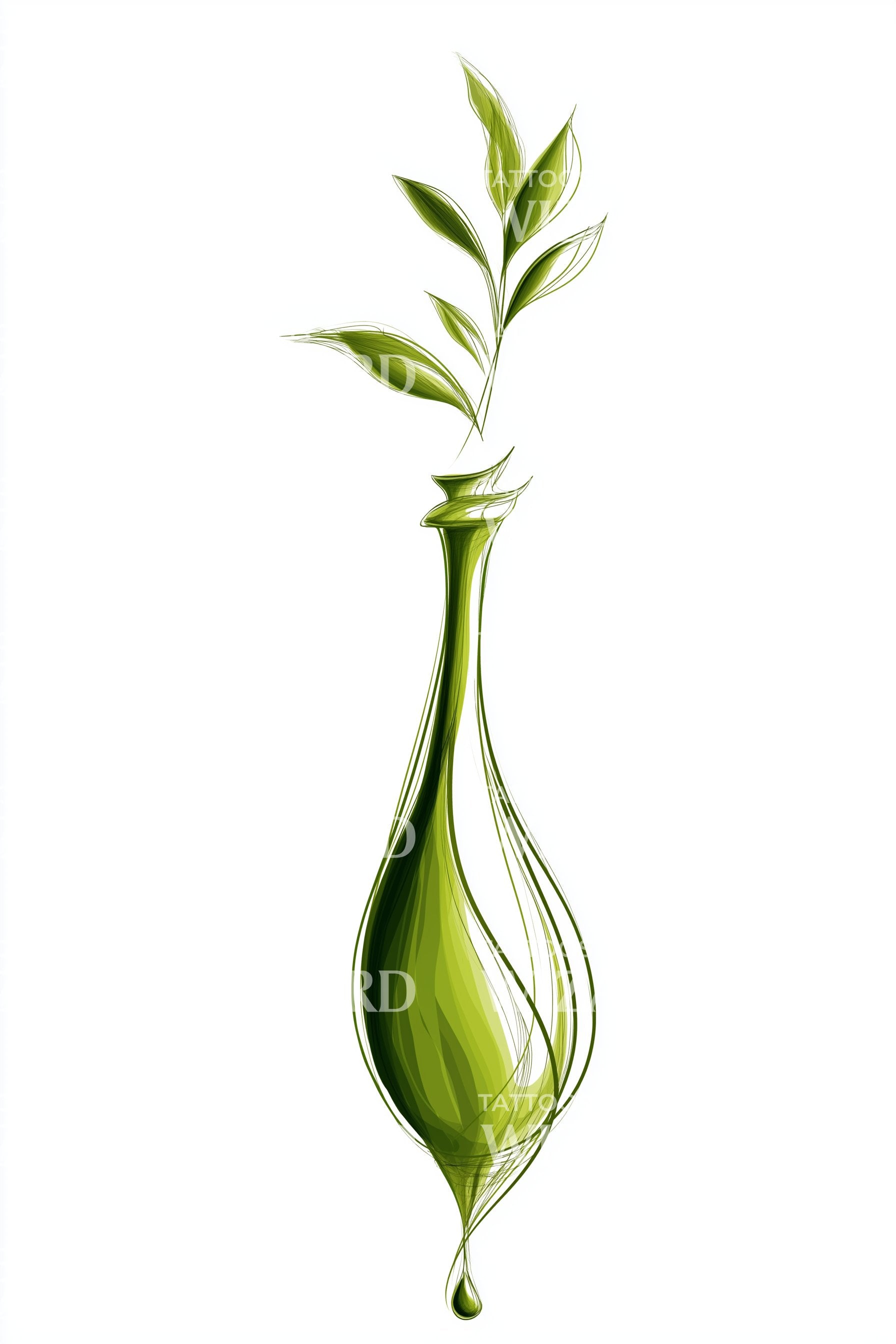 柔韧的绿色线条勾勒出一只纤细的花瓶,释放出一株嫩芽,仿佛植物的低语,象征着重生。流畅、半透明的阴影暗示着水与耐心;植物的生长是成长的见证。佩戴如同平静的勇气。非常适合前臂、小腿、脊柱或肋骨处,垂直的线条延展并引导向上。