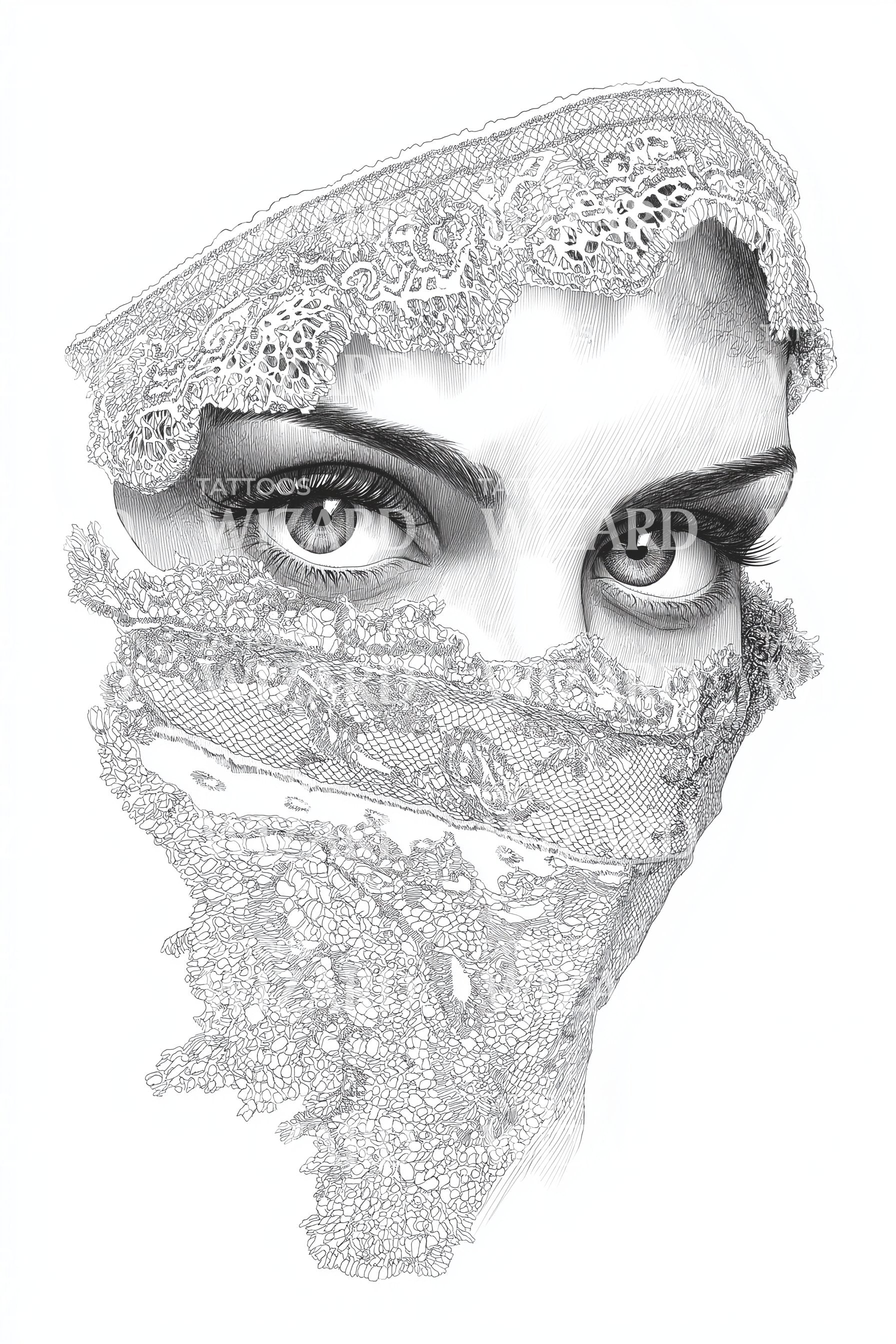 Velvet-gazed eyes emerge from a whisper of lace, rendered in meticulous realism and soft shadow. The veil suggests sacred privacy and power, while intricate threads honor feminine grace and resilience. Wearing it feels like carrying quiet fire: alluring, protected, watched-yet-unread, a beautiful mystery entirely your own.