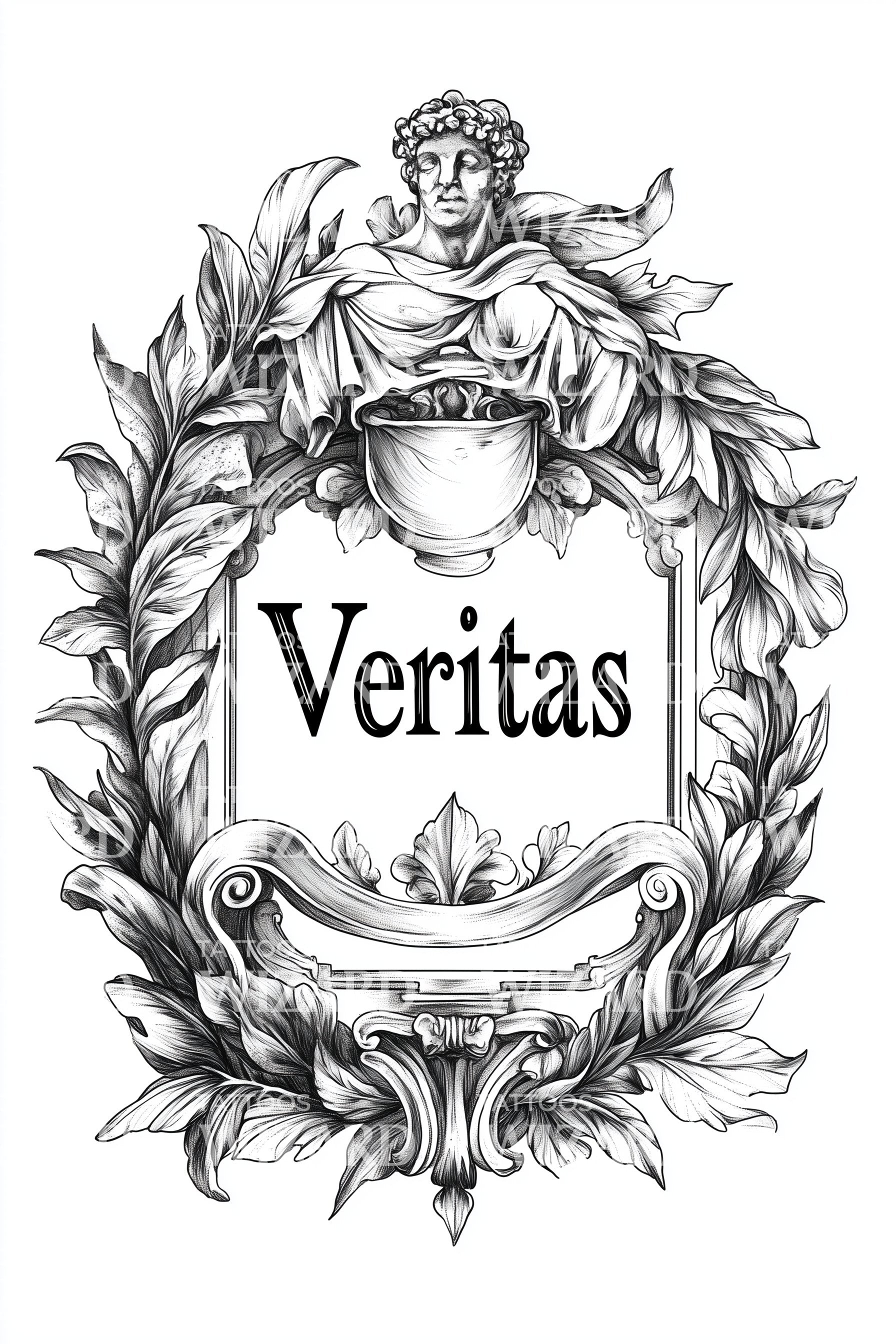 Ornate crest of laurel and acanthus frames the word Veritas, crowned by a serene classical bust and scrolling cartouche. Symbolizing triumph, honor, and unwavering truth, this emblem steadies the heart and clarifies purpose. Ideal on sternum, spine, upper back, or outer forearm for vertical balance and regal symmetry.