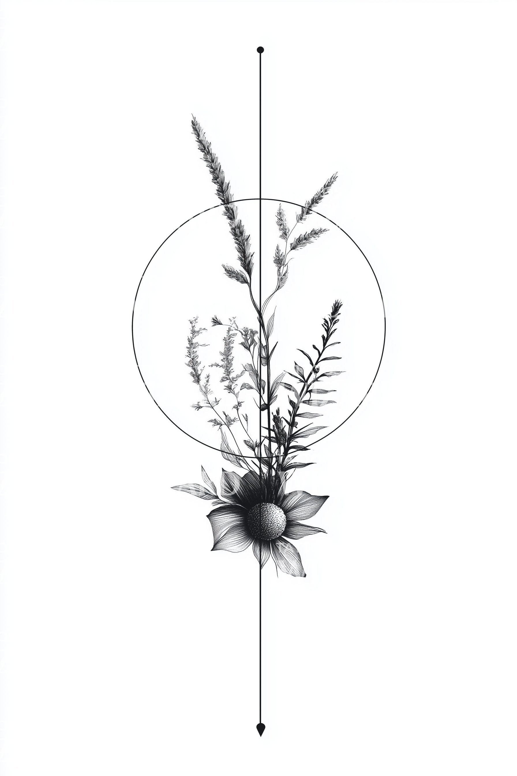 这款极简纹身设计完美融合了简约与优雅。其垂直的布局和流畅连贯的线条勾勒出一朵精致的花朵。非常适合喜爱宁静植物主题纹身艺术的您。其极简风格真正体现了少即是多的理念。