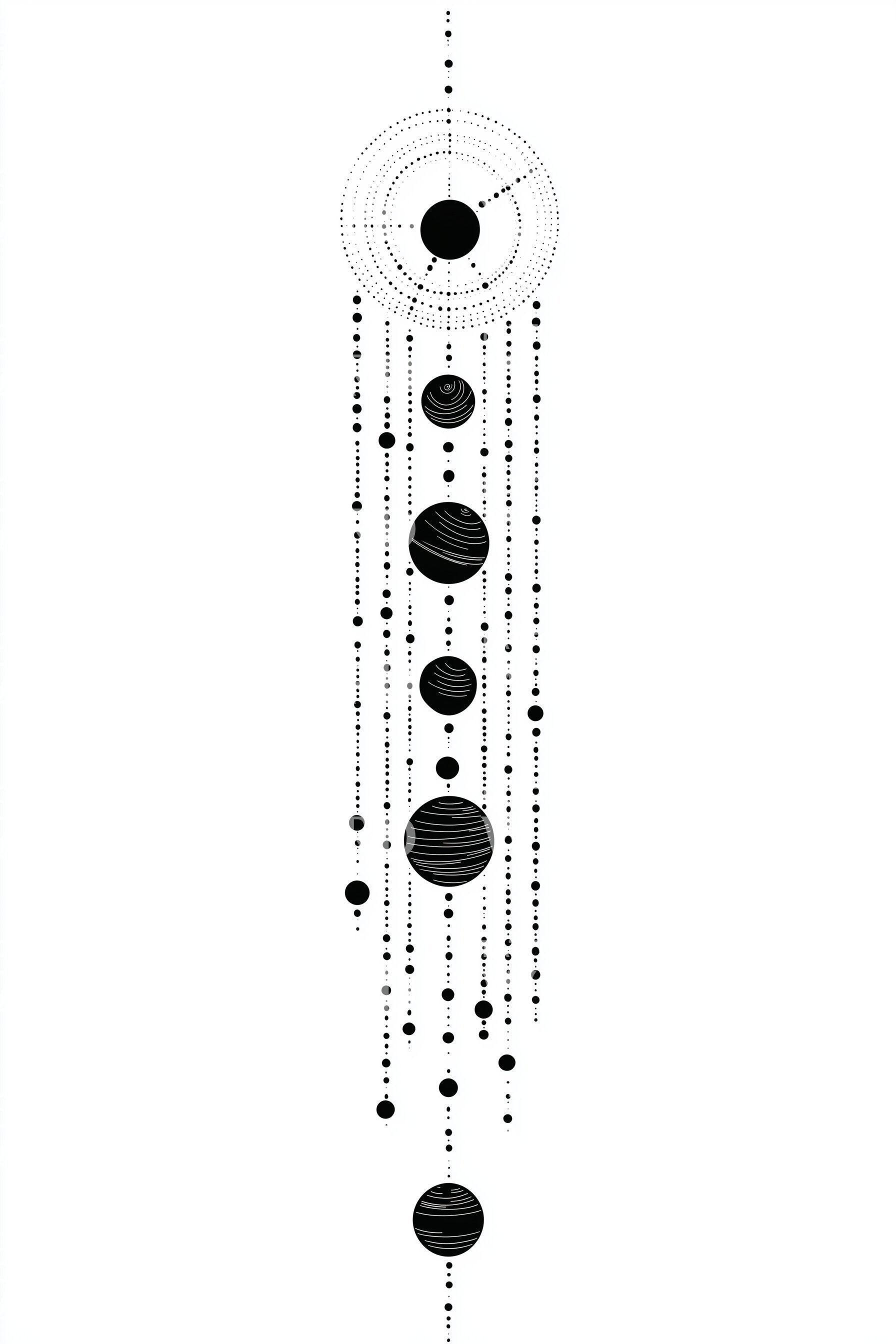 Celestial geometric lines cascade in a vertical constellation of dotted trails, concentric rings, and orb phases. The lunar cycle marks beginnings, growth, fullness, release, renewal. A compass for tides of change, it anchors intention and motion. Wearer feels grounded, quietly luminous, guided by night rhythm and inner orbit.