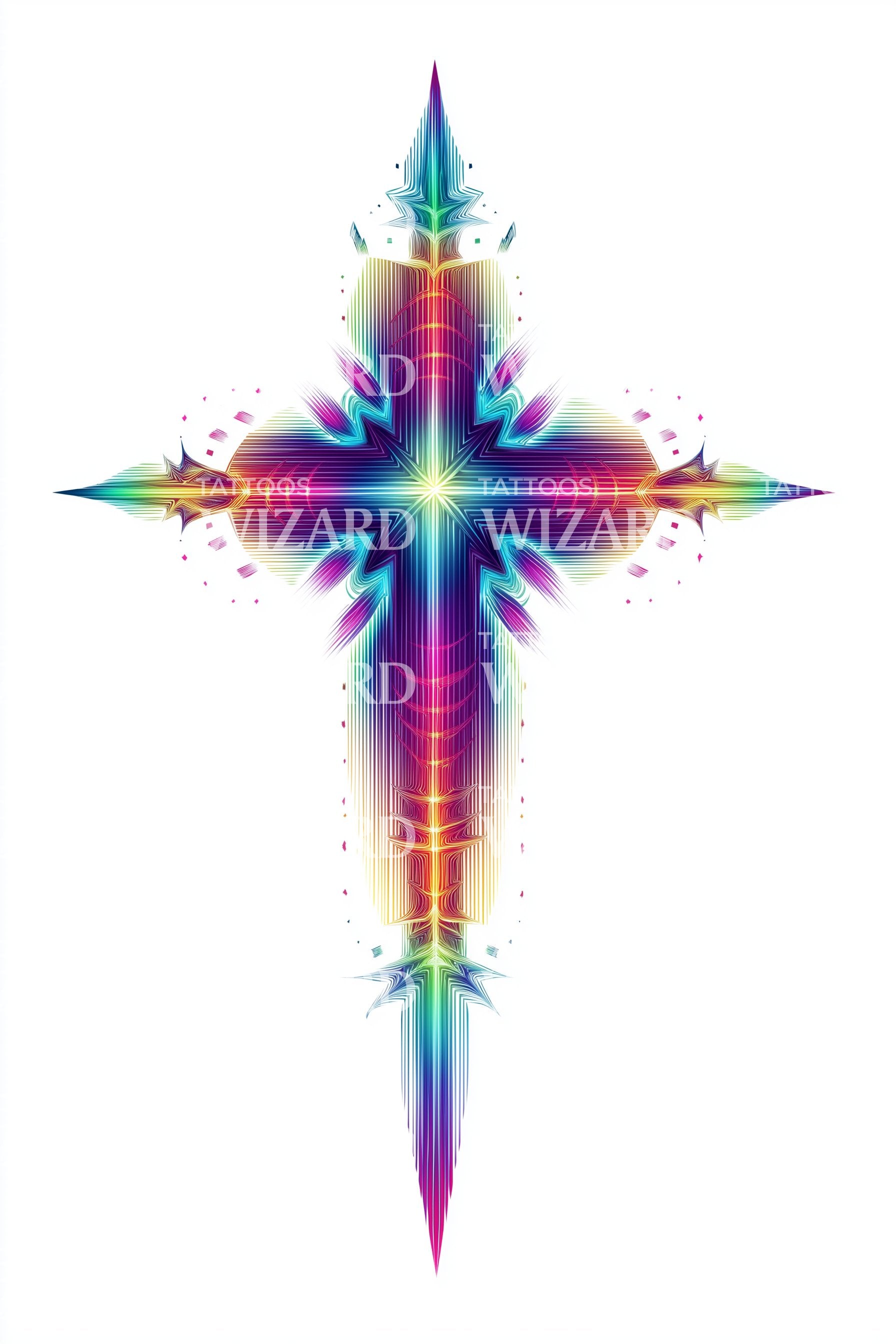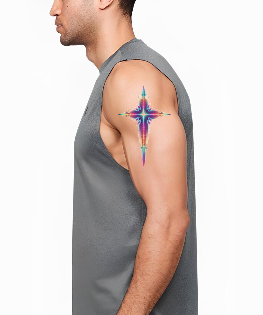 沉浸于这款水彩十字架纹身设计所展现的信仰多彩光谱。惊艳的渐变色为传统符号增添独特韵味,创造出如你般独一无二的信念表达。这款纹身大胆彰显你充满活力、坚定不移的信仰。