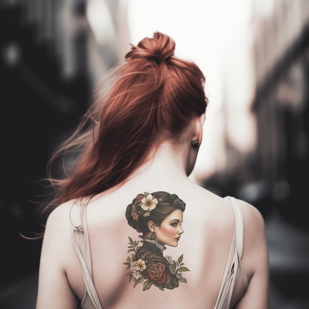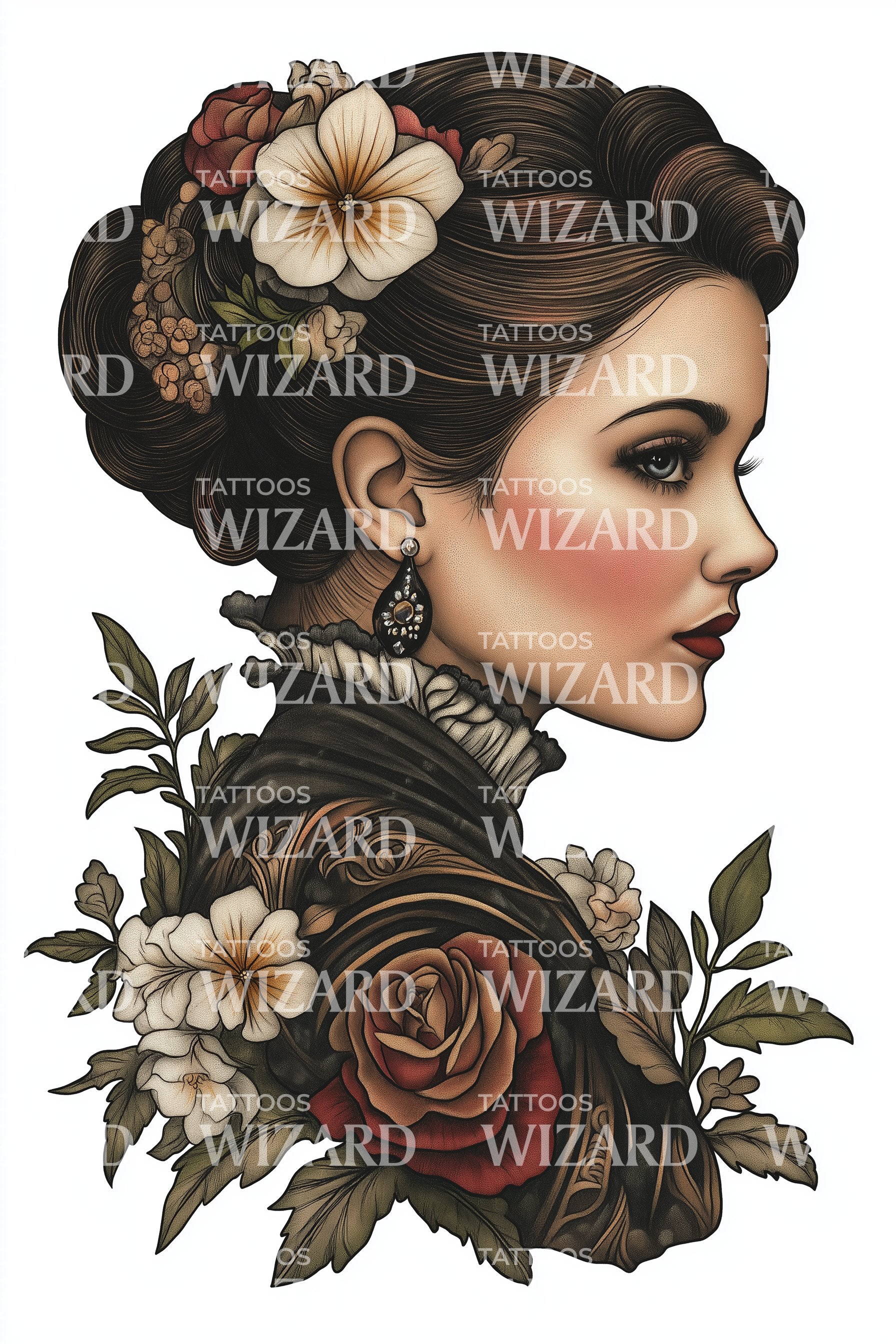 这款优雅的维多利亚风格纹身设计融合了女性气质与优雅。以一幅精美描绘的复古女士肖像为特色,设计巧妙地与玫瑰花交织,展现出迷人的花卉美学。非常适合热爱浪漫历史与永恒优雅纹身艺术的您。