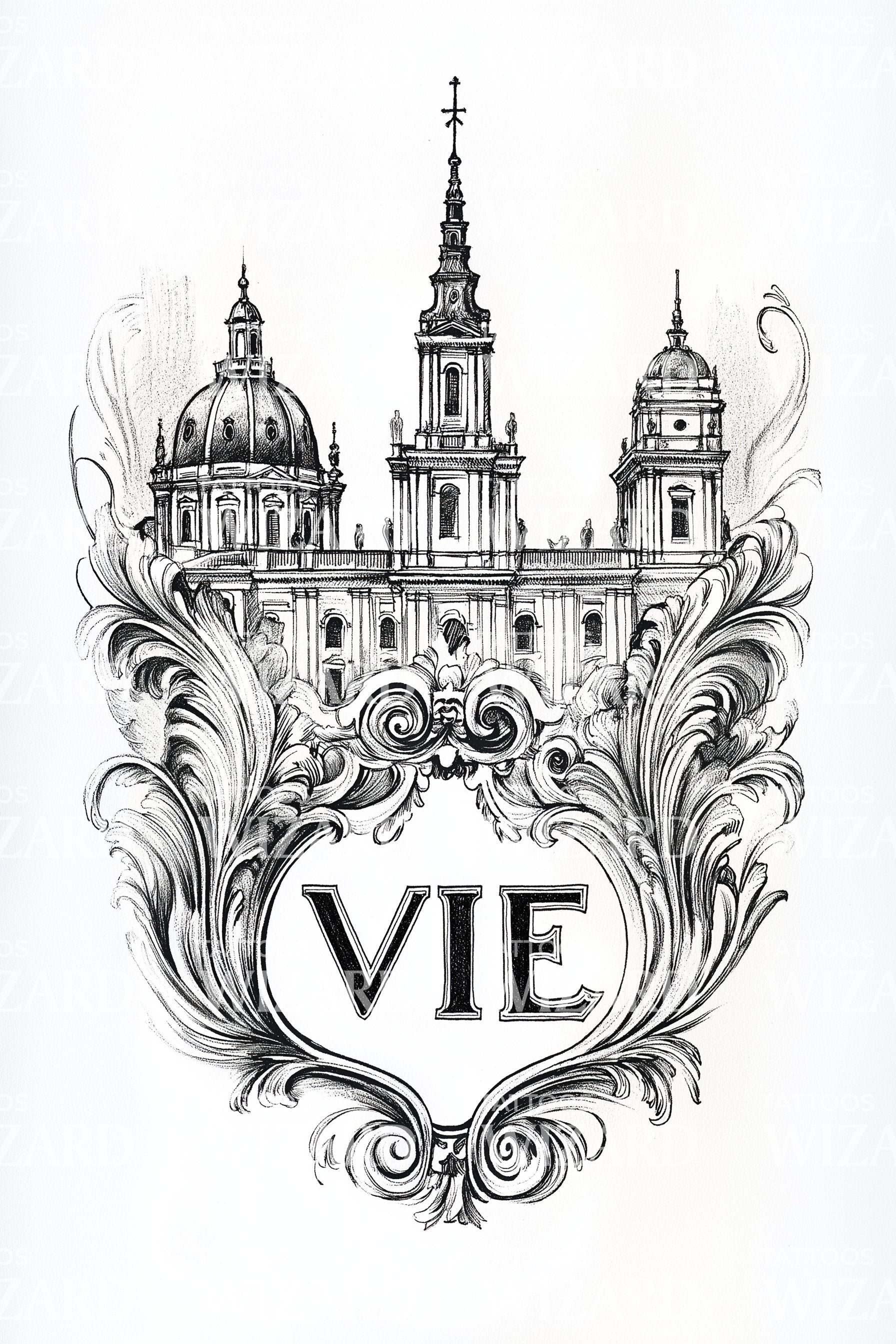 Baroque cathedral rises in fine ink, domes and spires crowned by ornamental acanthus, cradling bold VIE. Vienna’s soul distilled, where life and the city converge, honoring Austria’s devotion, music, and endurance. Wearing it feels like carrying sacred arches and crescendos, a romantic compass toward wonder and timeless belonging.