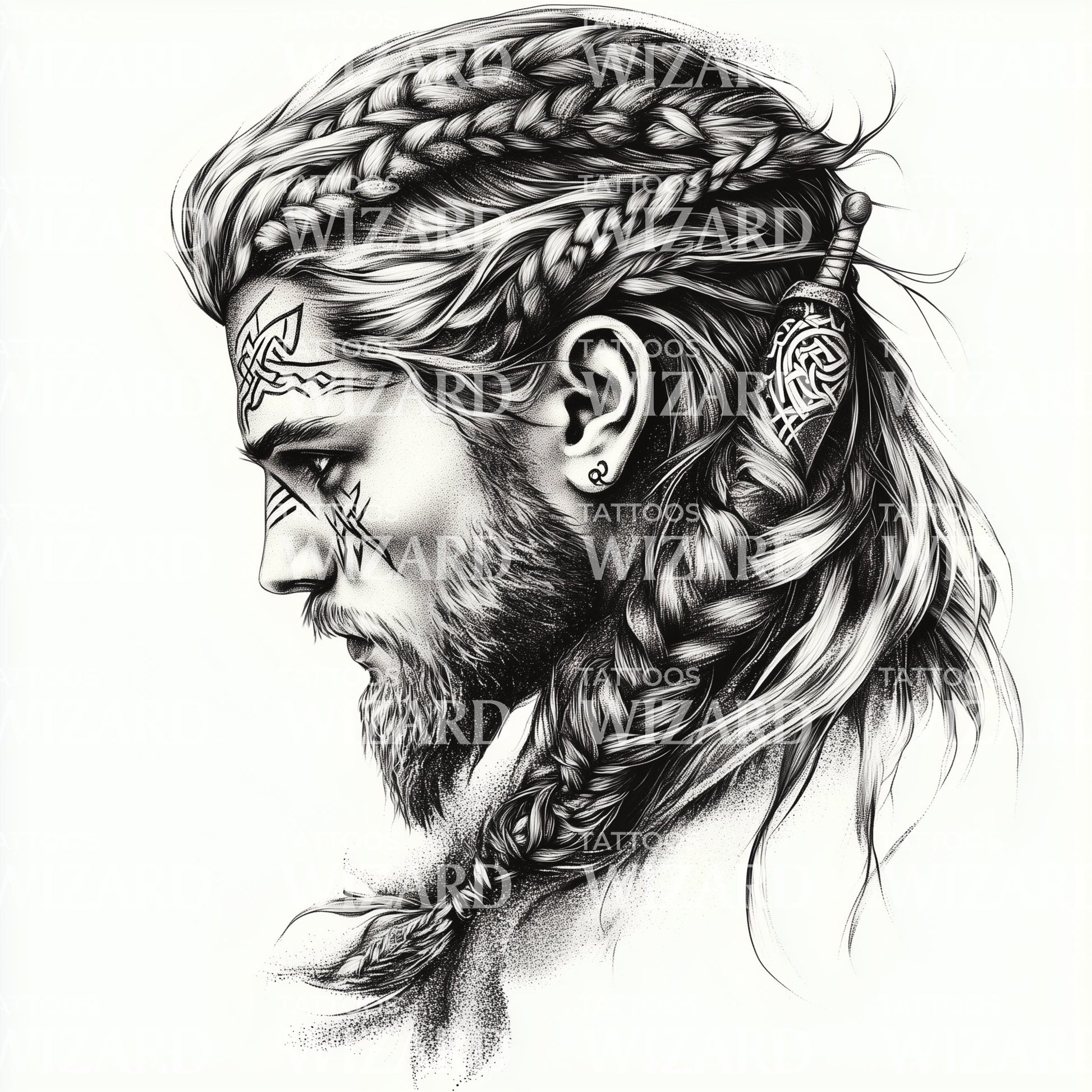 沉浸在勇敢维京人的神秘历史中,这款点刺纹身设计精细地描绘了一位留着胡子的战士,装饰着经典的辫子,体现了男子气概和令人惊叹的坚韧。对于那些欣赏维京人韧性和勇猛的人来说,这是一个理想的象征。