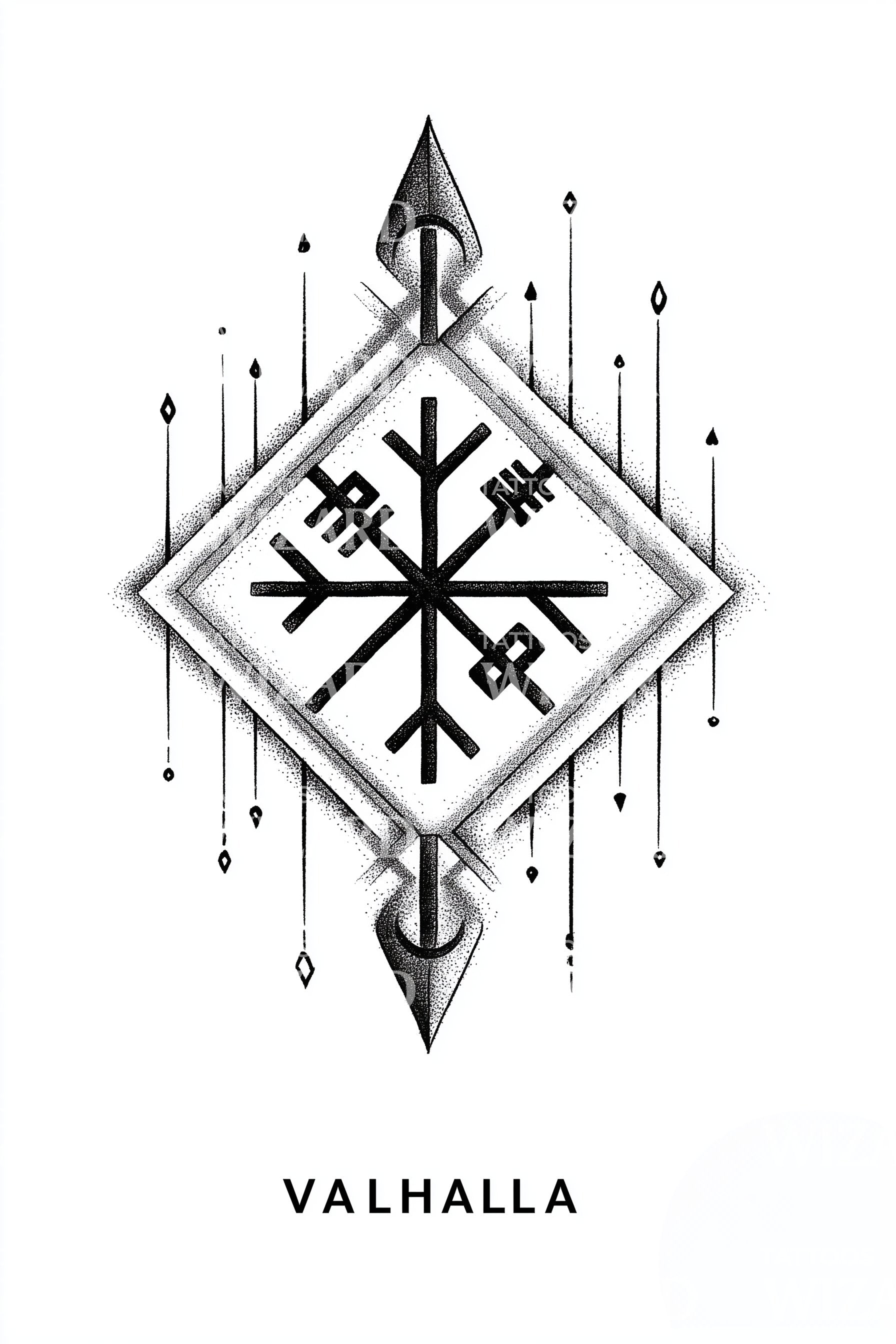 Diamond-forged blackwork frames a runic compass, bracketed by spearpoint geometry and drifting star-drops. Symbolizes the Viking road to Valhalla, protection in battle, and calm guidance through storms. Wears like quiet steel, resolute and fearless. Ideal placements: forearm for flow, sternum for symmetry, spine for ascent, calf for drive.