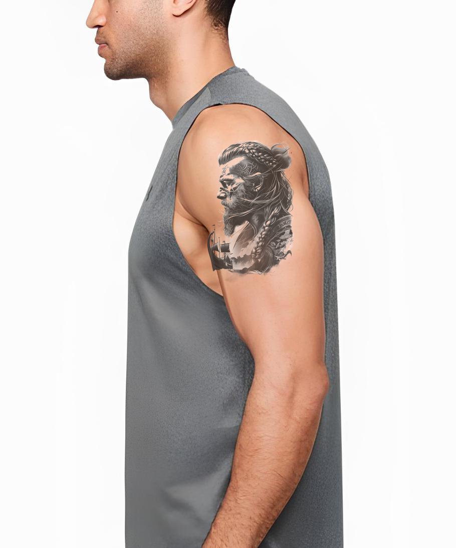 沉浸在北欧民间传说中,这款黑灰色的维京纹身设计是勇气的典范,生动地描绘了一位在船上勇猛的维京战士,唤起了力量和勇气的叙事。非常适合做袖子纹身,它体现了不屈的韧性和前卫的美学。