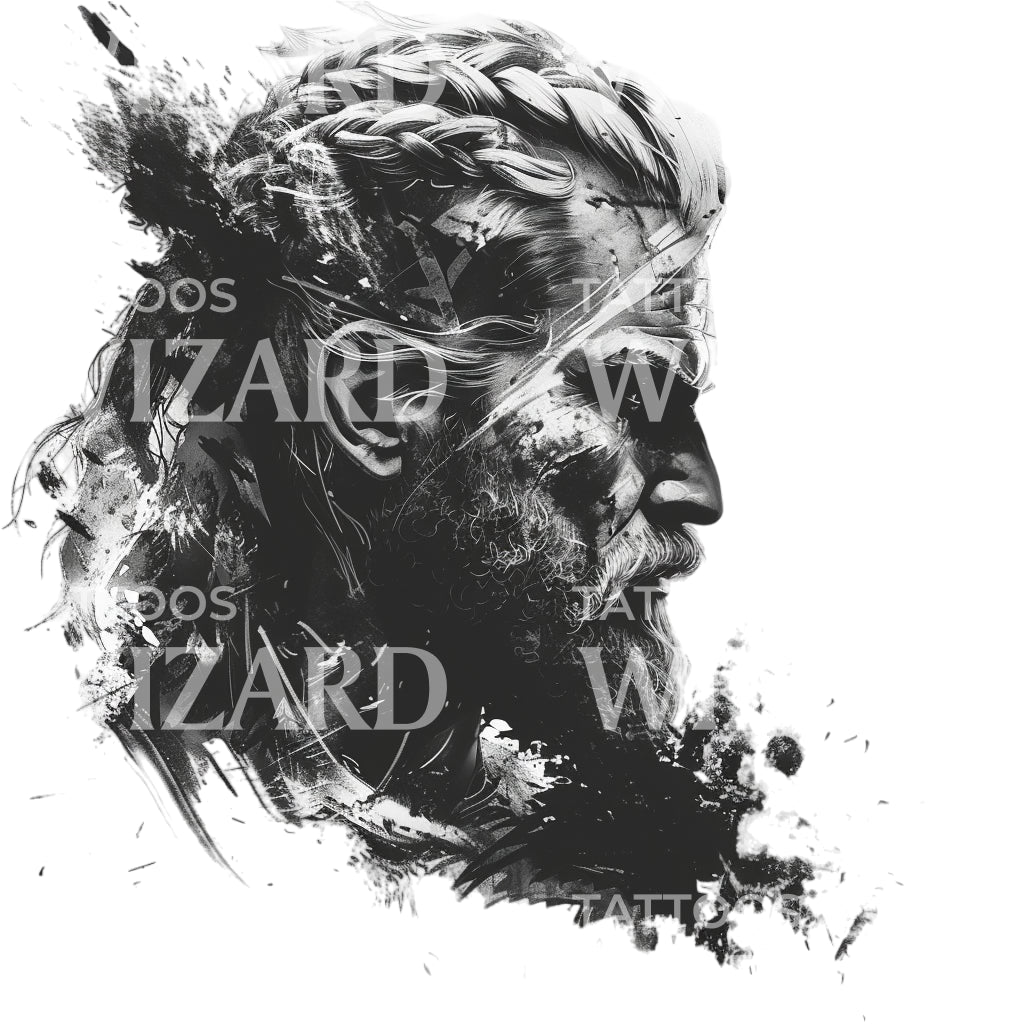 这个迷人的北欧战士纹身设计深受维京传说的影响,向著名人物如比约恩和埃里克致敬。采用浓烈的黑灰色调构思,描绘了一位神一般的维兰德男子那强烈而凶猛的面孔,精心刻画成战士的草图。这在身体艺术领域中是一个大胆的声明。