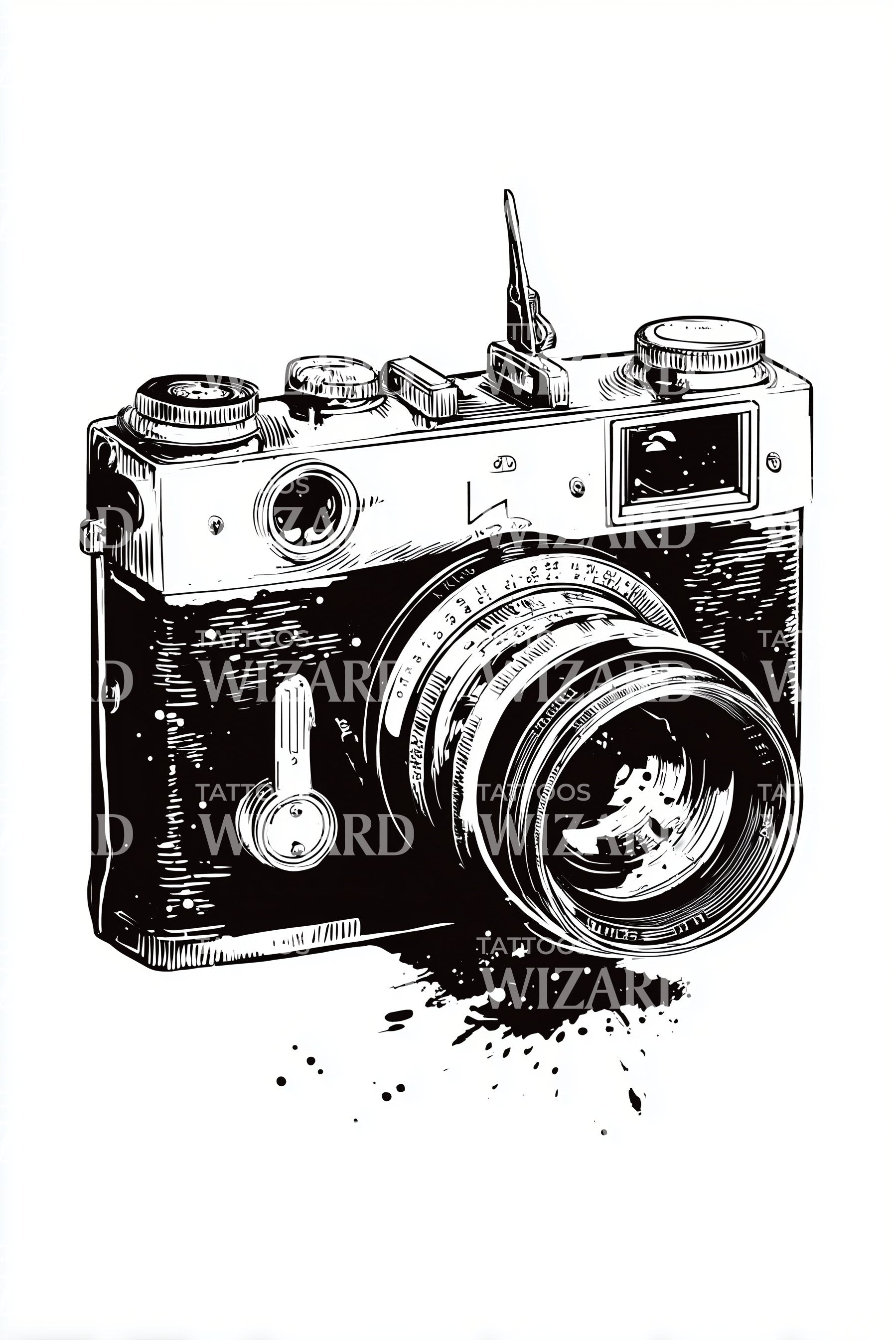 复古测距相机以清晰的墨迹呈现,镜头栩栩如生,飞溅的阴影如同显影液在胶片上。象征着被框定的真相与时间,致敬复古摄影与记忆。佩戴如同好奇与勇气。理想位置:前臂呈线性流动,小腿如画框,肩胛骨如镜头,胸膛承载心中故事。