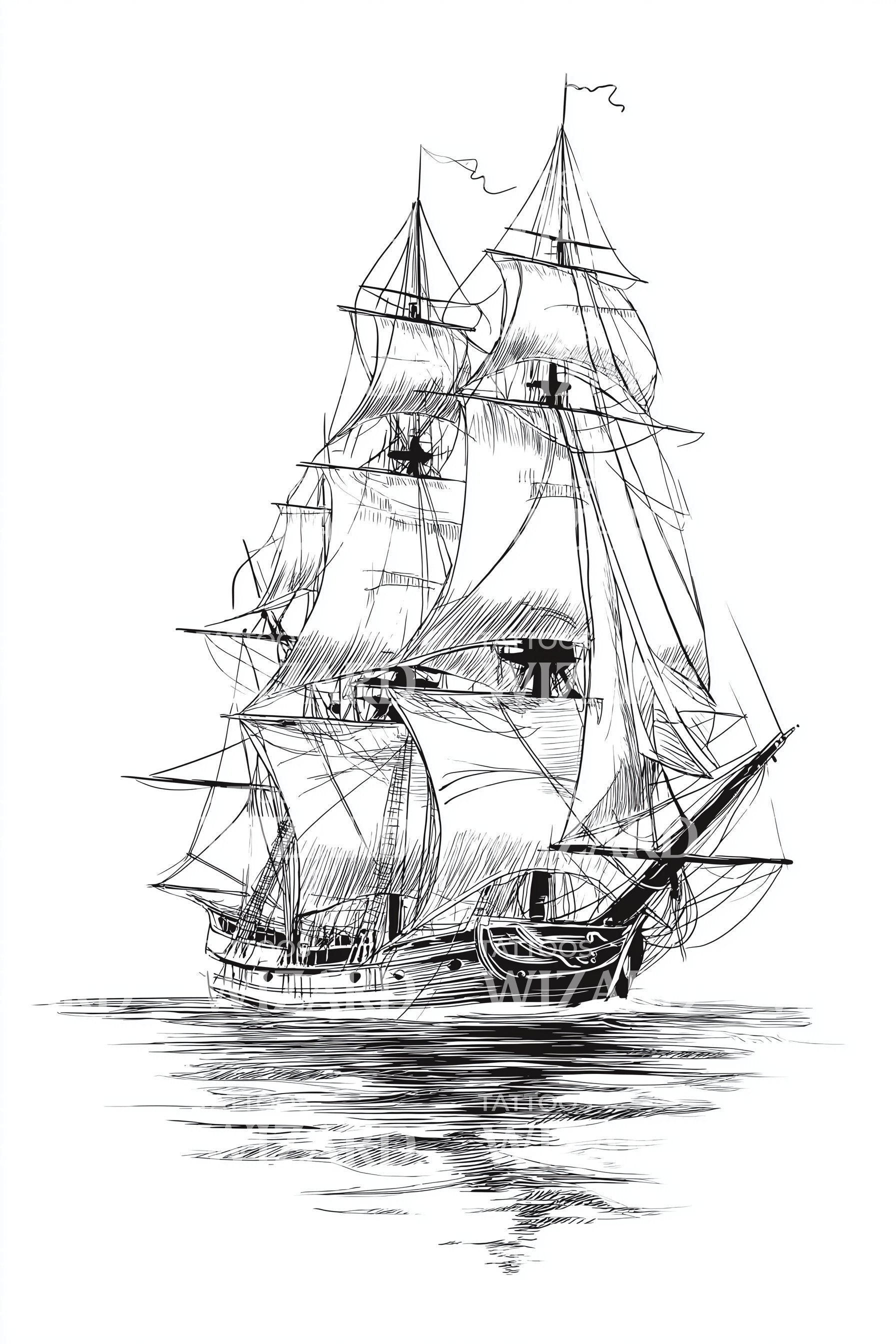 Vintage galleon in crisp black sketch, rigging tangled with wind, billowing sails and mirrored sea lines, like a page torn from a nautical chart. Symbolizes exploration, resilience, and self-guided destiny. Worn daily, it feels like a quiet compass, stirring wanderlust, salt-air courage, and onward momentum through every tide.