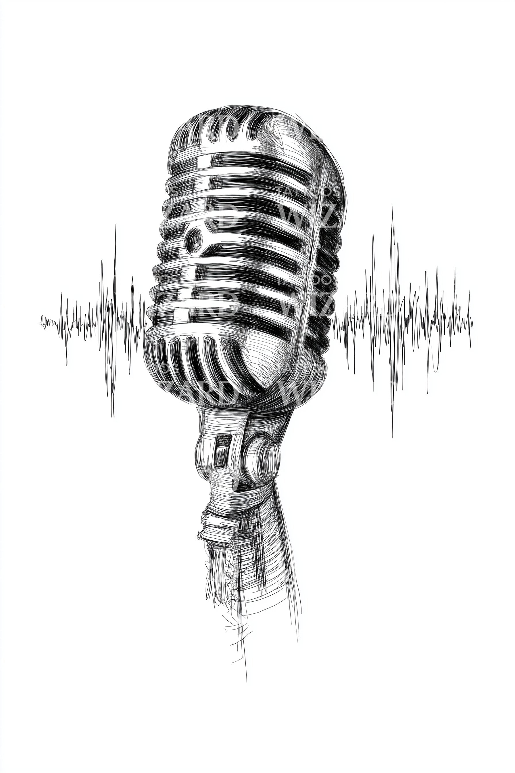 Vintage chrome microphone etched in crisp realism, flanked by pulsing radio waves. Symbol of voice, courage, and timeless sound, honoring retro broadcast roots and every story worth airing. Wears like confidence. Ideal on forearm or calf for vertical flow, outer bicep for bold display, ribcage for intimate resonance.