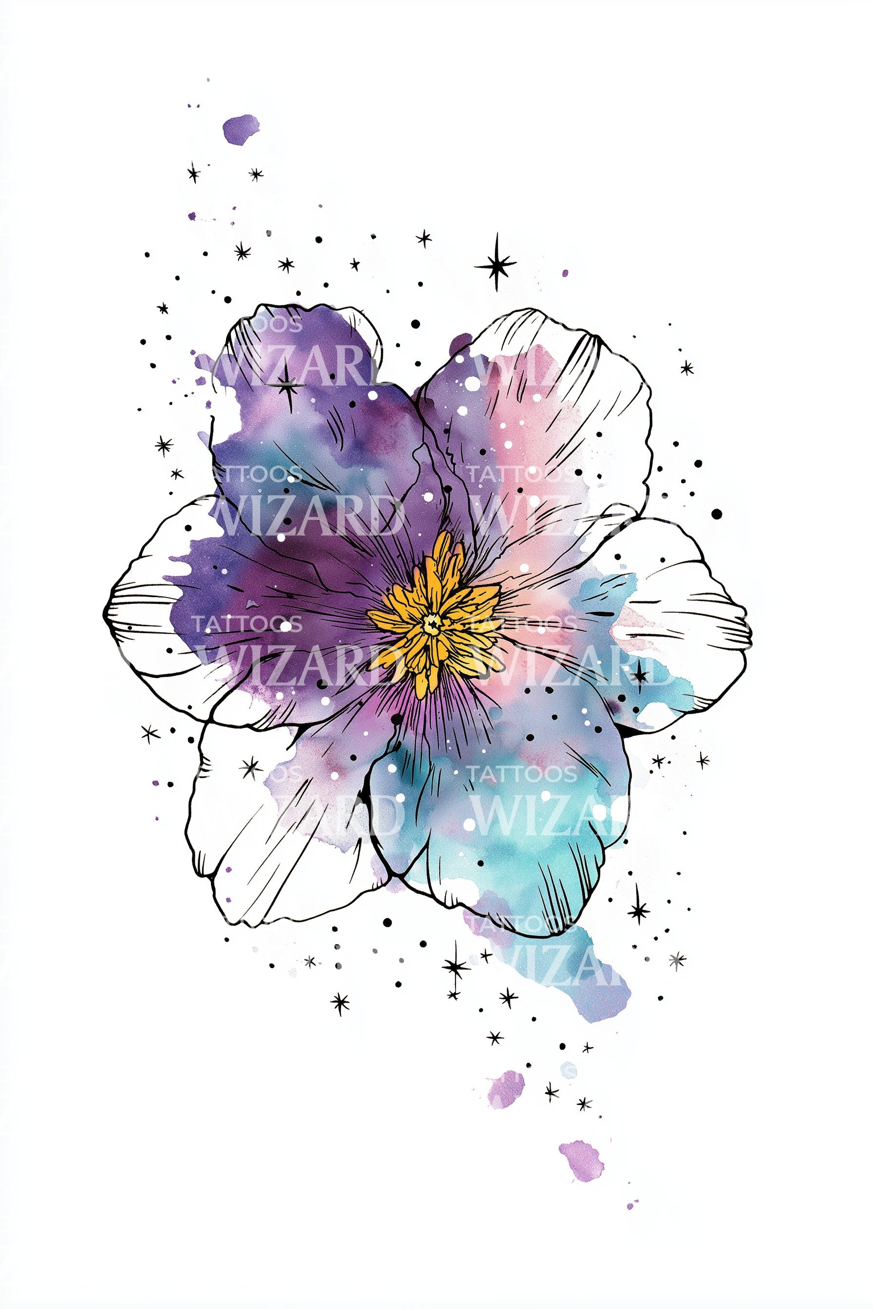 沉浸于这款花卉纹身设计的梦幻幸福中。以美丽的紫罗兰色调绽放,水彩飞溅技法赋予其独特的魅力与奇思妙想。这件充满美感与细节的迷人作品,是欣赏身体艺术柔和且富有艺术气息一面的理想之选。