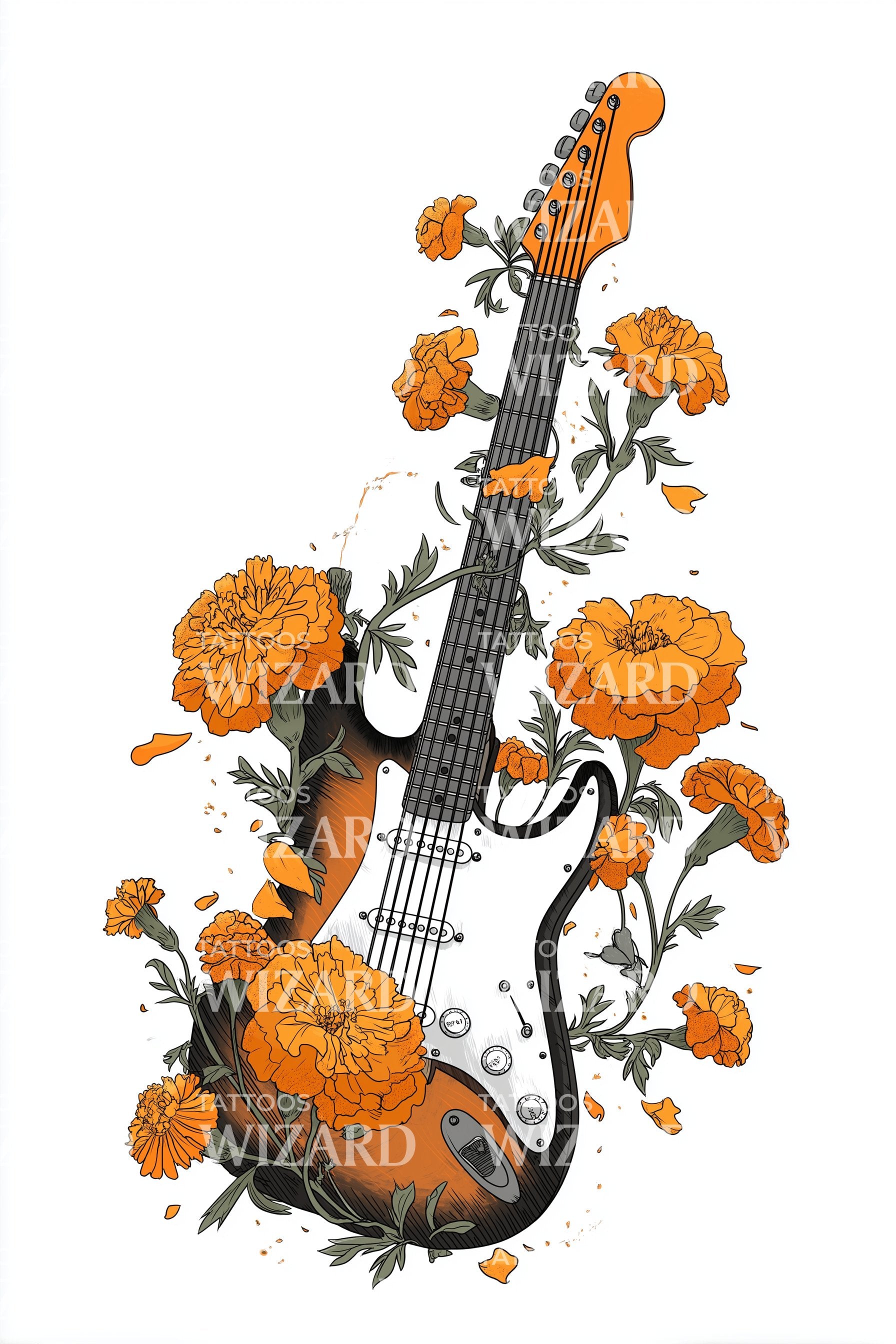 沉浸于大自然的交响乐中,这款新传统纹身设计融合了一把令人惊叹的橙色小提琴,缠绕着精致的植物花卉,象征着一段悠扬的旅程。琴弦的细节增添了逼真的质感,使其成为那些在大自然宁静中寻找音乐的人们独特的艺术作品。