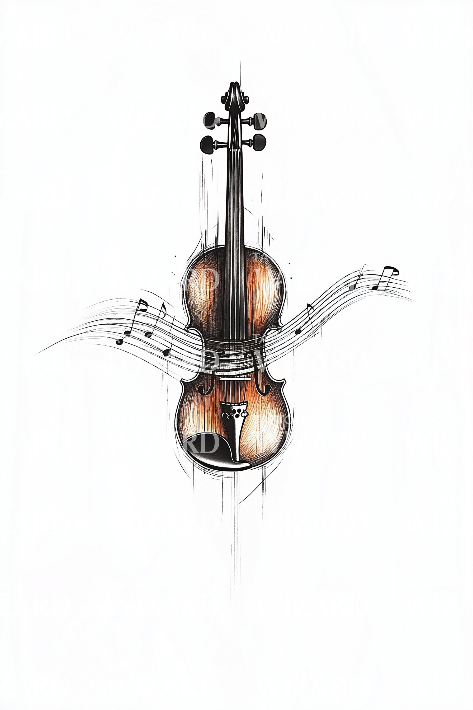 火焰般明亮的小提琴由粗黑线条勾勒,细腻的鞭状阴影和挥洒的五线谱翅膀在新传统节奏中歌唱。琴弦象征纪律;翅膀和音符回响着自由、飞翔与旋律。佩戴者感到振奋,自我引领,与变化和谐共鸣。理想位置:前臂、脊柱、小腿或肋骨处,适合垂直流动和翅膀展开。