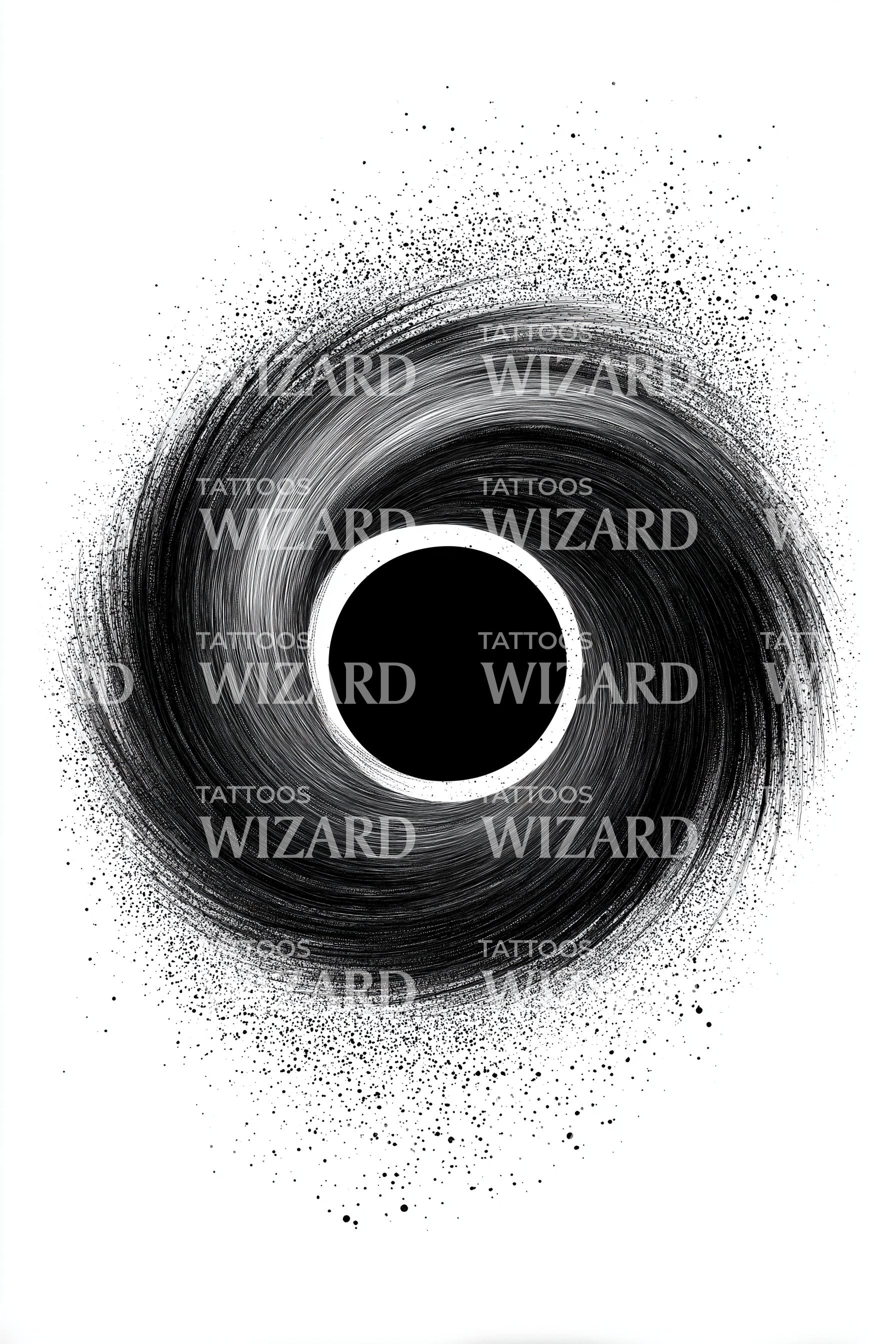 Blackwork vortex rings a stark void, brushed arcs spiraling into a luminous halo, dusted with starburst speckles. Symbol of orbit and becoming, it holds gravity, change, and the energy of space. Wearing it feels centered and electric, a quiet cosmos humming at the skin, inviting fearless momentum.