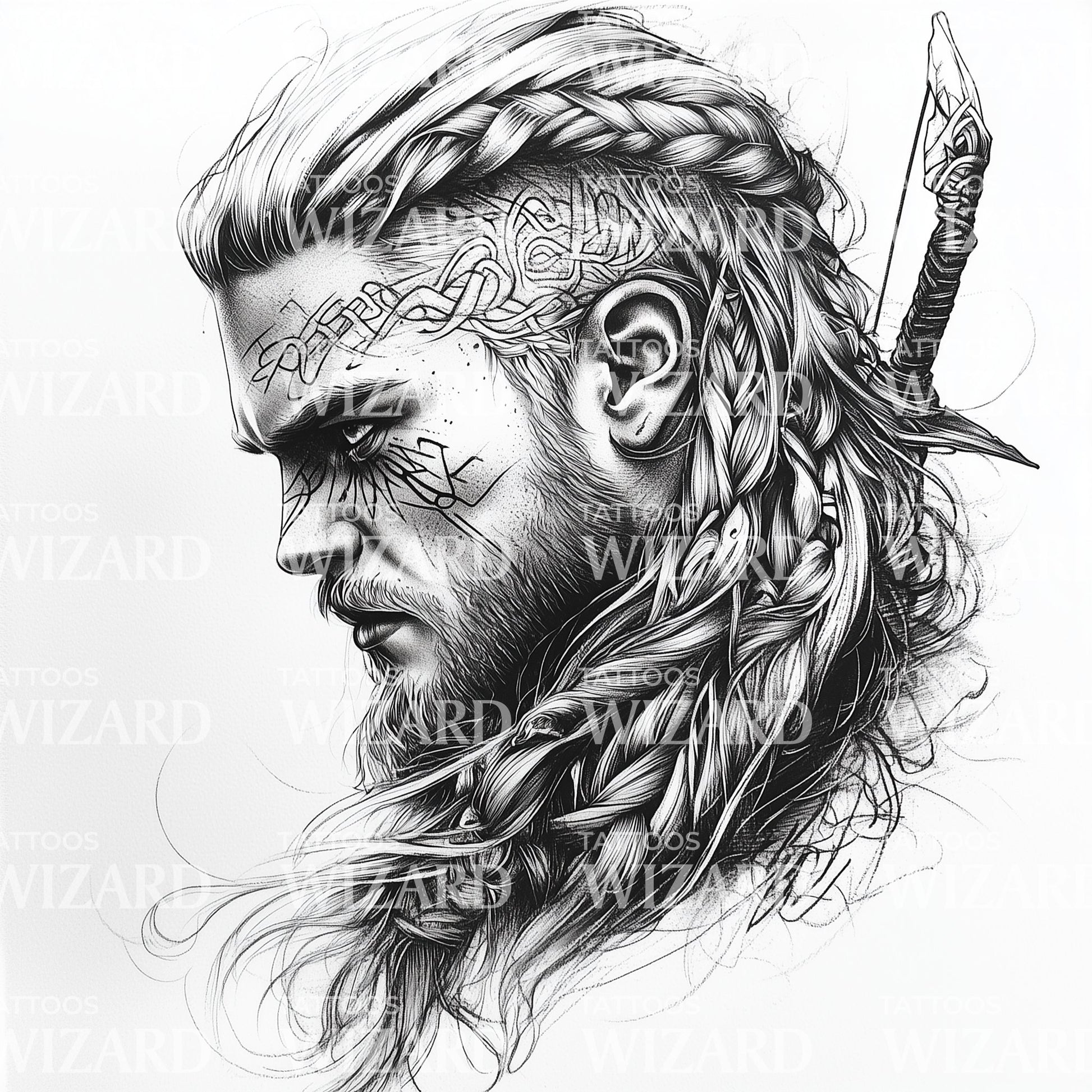 沉浸在北欧的勇气中,欣赏这款点刺纹身设计。它体现了一位可怕的维京战士,复杂的设计展示了强壮的胡须、战士辫子和一把威武的剑。传统的头盔细节增添了不可错过的历史风采。用这款独特的纹身体现北欧的坚韧。
