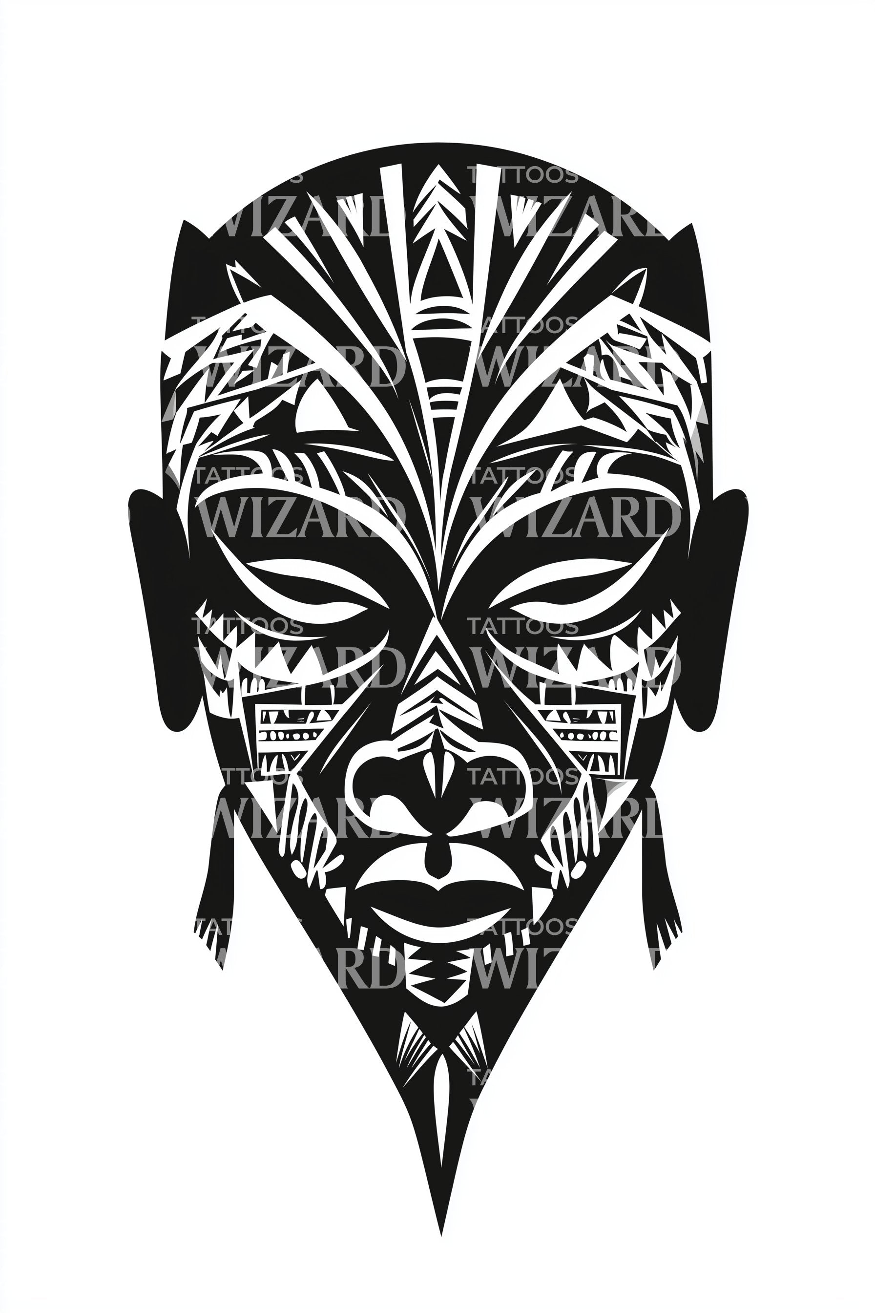 Bold Polynesian tribal lines carve a warrior mask, layered chevrons and spearhead motifs meeting at a pointed chin. Symbols of vigilance, ancestry, and protection converge, guiding courage through ink. Wearer feels grounded, unshakable. Ideal placements: sternum for symmetry, upper back for presence, calf or forearm for tapering flow.