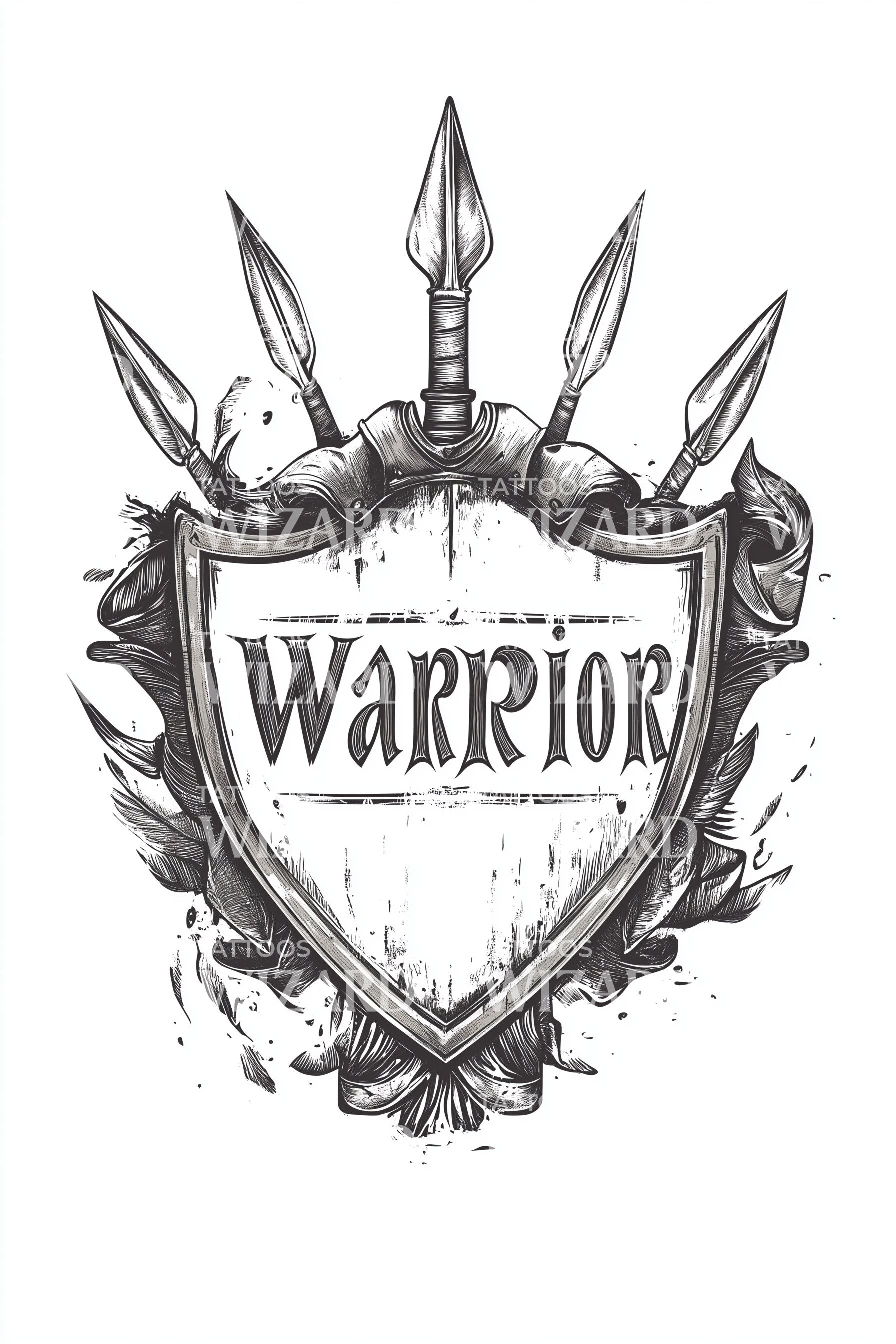Ornamental crest etched in charcoal lines, a timeworn shield crowned by five poised spears and wrapped in flowing ribbons. Each element honors vigilance, courage, and steadfast defense. Bearing Warrior across its heart, it becomes a vow of valor, gifting the wearer grounded strength, dignity, and forward-burning resolve.