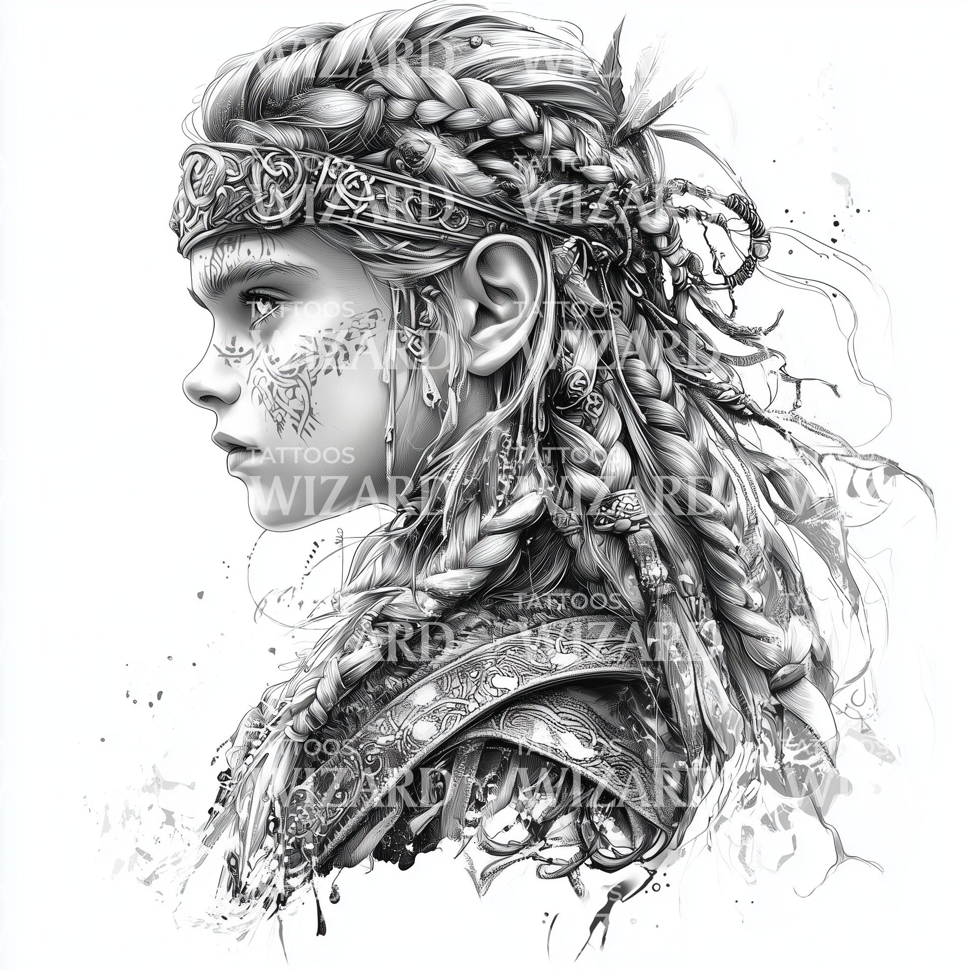 沉浸在古老的勇气中,这款黑灰色的纹身设计展示了一位年轻的传奇战士男孩,精彩地体现了凶猛的维京精神。每一个编织的细节都回响着传奇的坚韧,代表着你内心的战士,准备征服生活中的战斗。