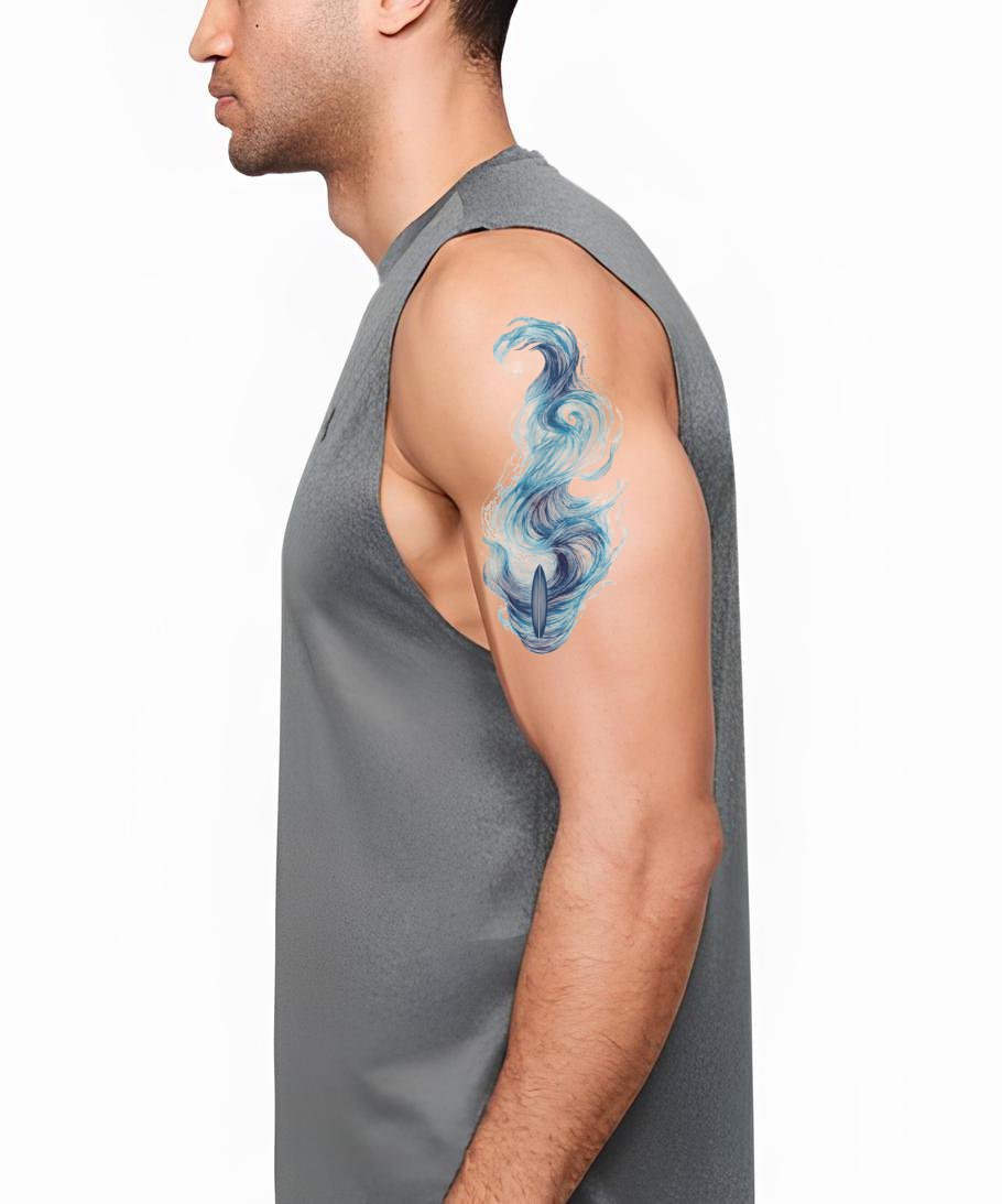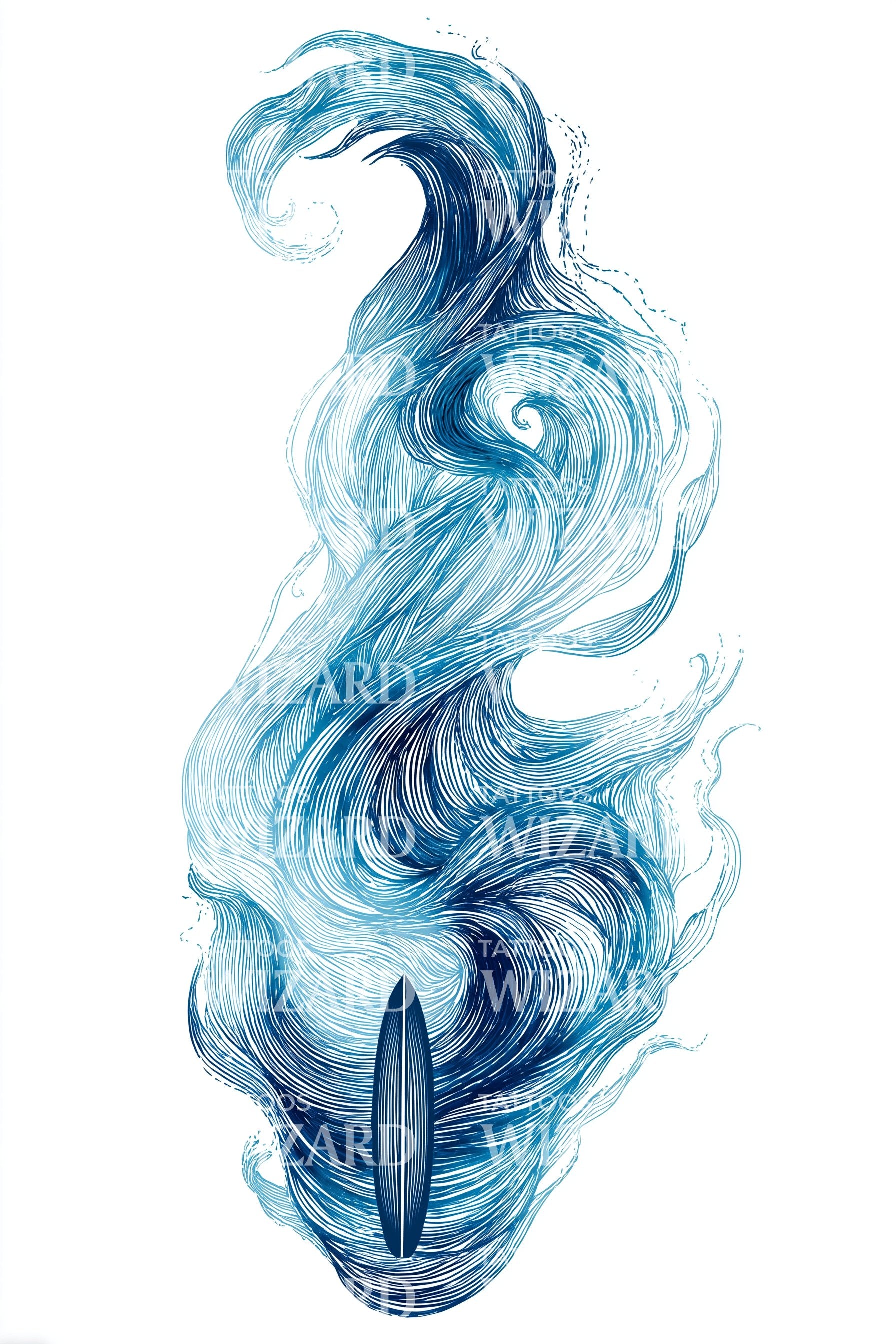 Liquid watercolor lines spiral in layered blue swirls, a surfboard cradled within a cresting, wind-swept plume. Symbolizing spirit in motion, it channels water’s resilience, surrender, and fluid energy. Wearer feels calm power and freedom. Ideal placements: forearm, spine, outer calf, or ribcage, where vertical flow elongates, breath animates.