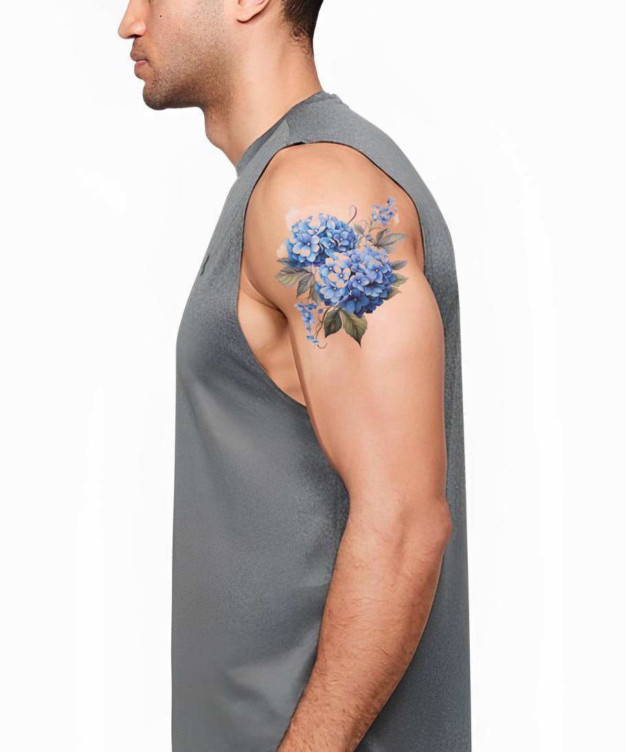 用这款惊艳的水彩花卉纹身设计释放你内心的美。大胆的绣球花在宁静的蓝色阴影中形成鲜明的对比。非常适合热爱花卉优雅的人。用我们的水彩蓝色绣球花设计提升你的纹身美学。